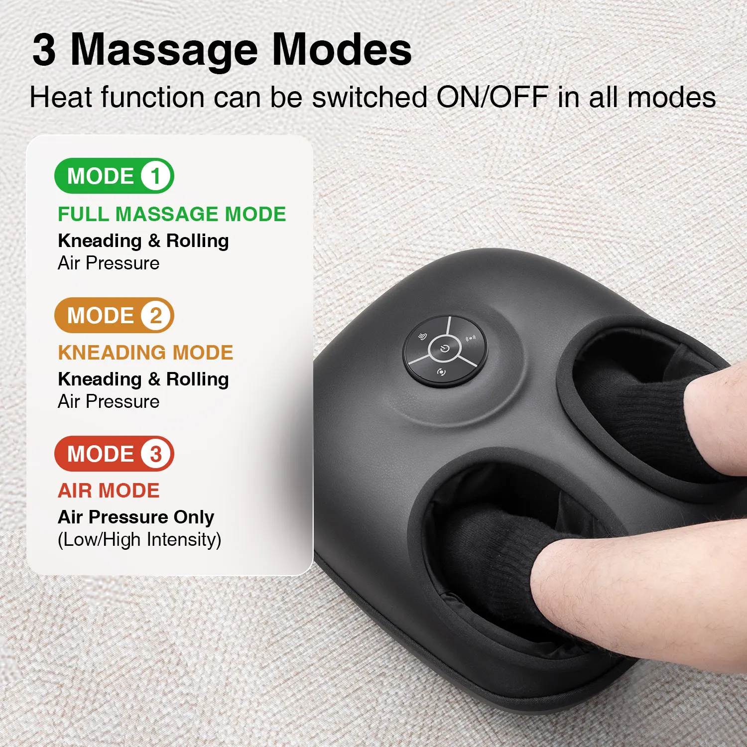 3 Massage Modes: Default mode activates automatically. Press the "Mode" button once for Massage Mode or twice for Air Pressure Mode.