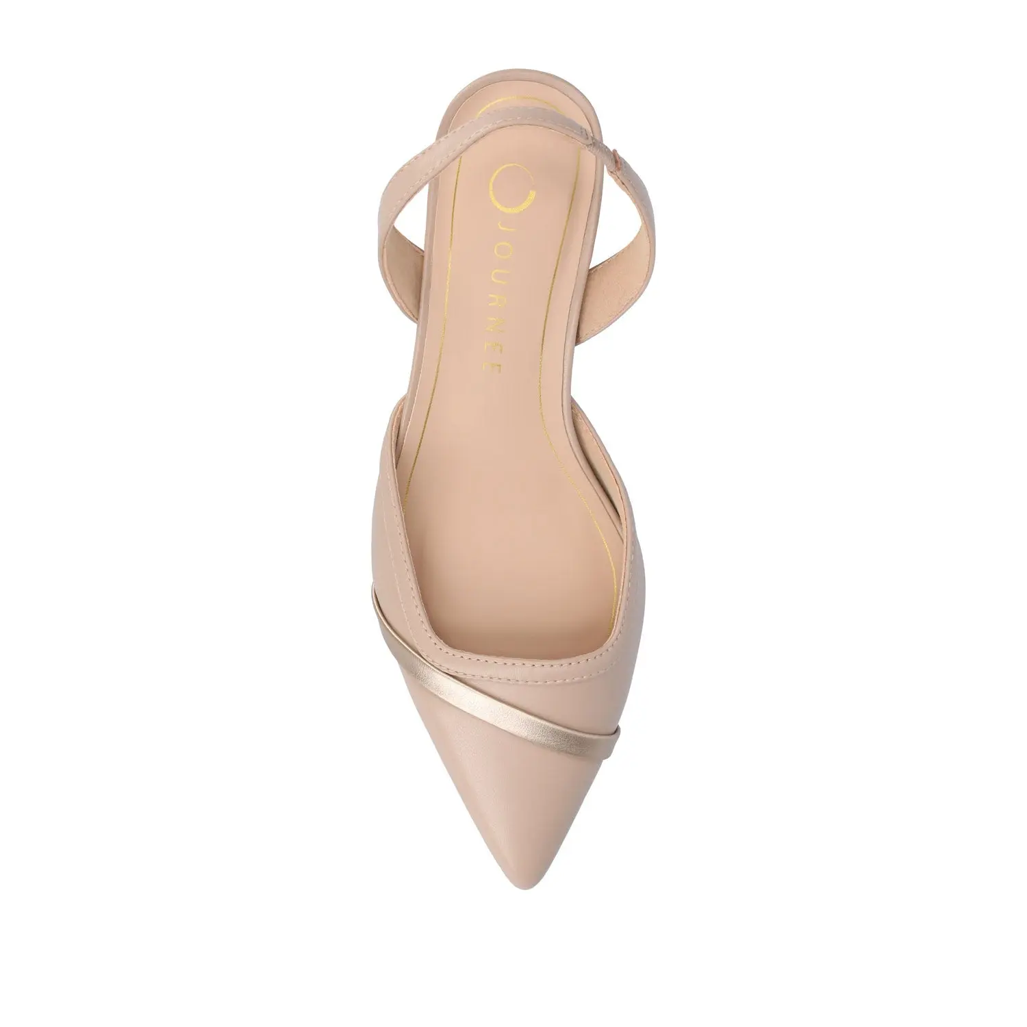Elevate your style with the Nellia slingback heel from Journee. It showcases a pointed toe and a graceful 2 Inch kitten heel for a timeless and sophisticated look. The slip-on design and slingback strap offer ease of wear and a secure fit. Padded Insole 2 Inch Kitten Heel Pointed Toe Slip-On Fabric or vegan leather All measurements are approximate and were taken using a size 6. Please note measurements may vary slightly by size.