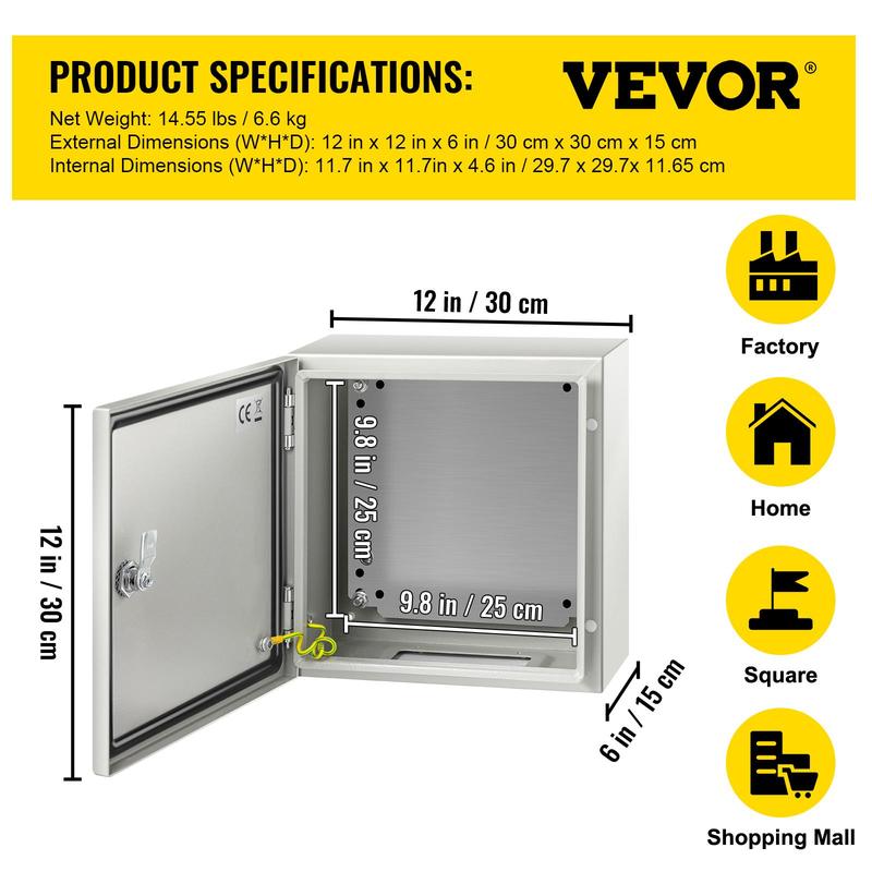 5. VEVOR NEMA Steel Enclosure, 12 x 12 x 6'', IP66 Waterproof & Dustproof, Outdoor/Indoor Electrical Junction Box with Mounting Plate
