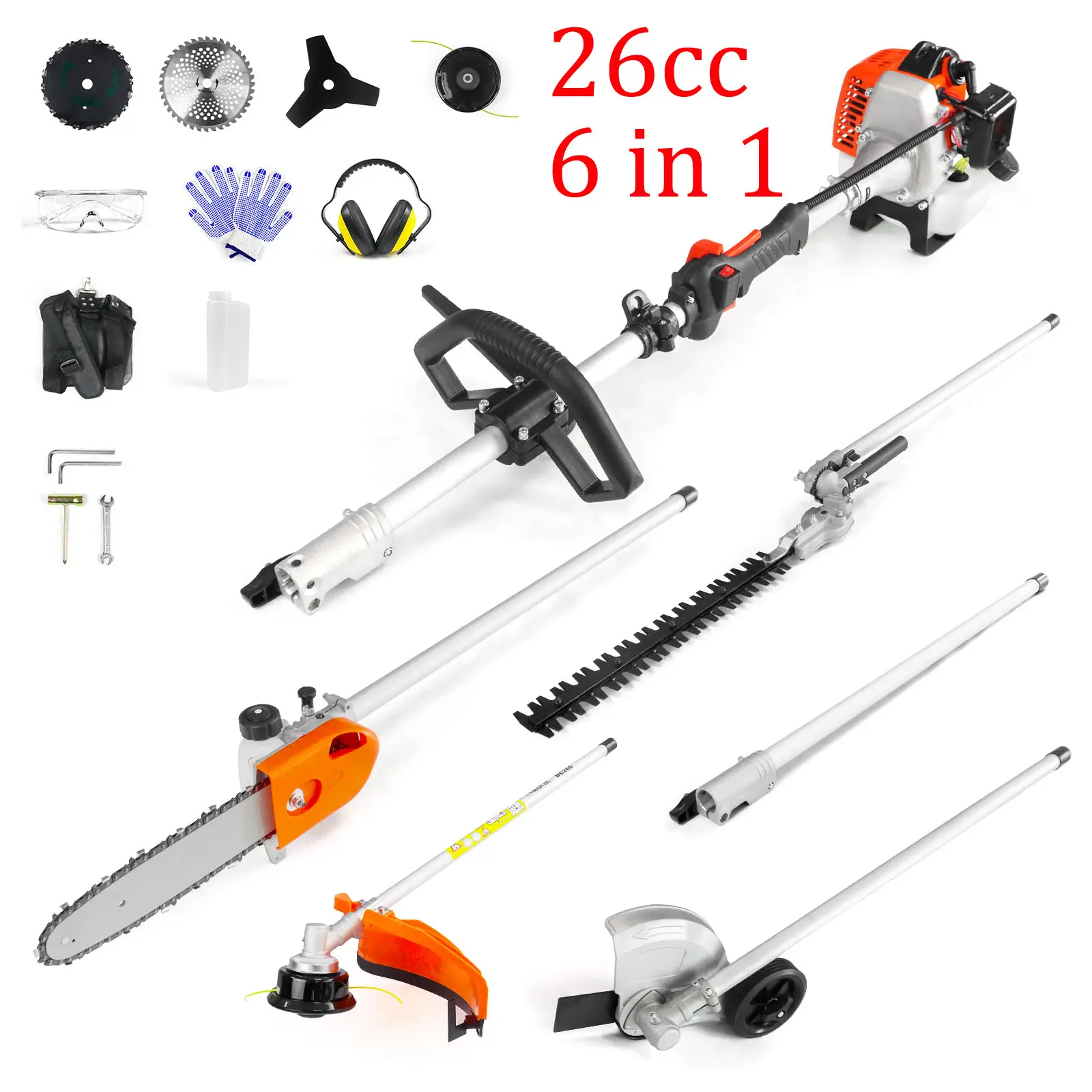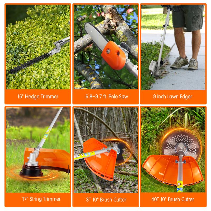 This multifunctional trimming tool set includes a 17" string trimmer, 9" edger, 10" pole saw, 16" hedge trimmer, 10" brush cutter, and a 31.5-inch extension pole. It's perfect for various yard tasks. The set ensures comprehensive coverage with its diverse tools.