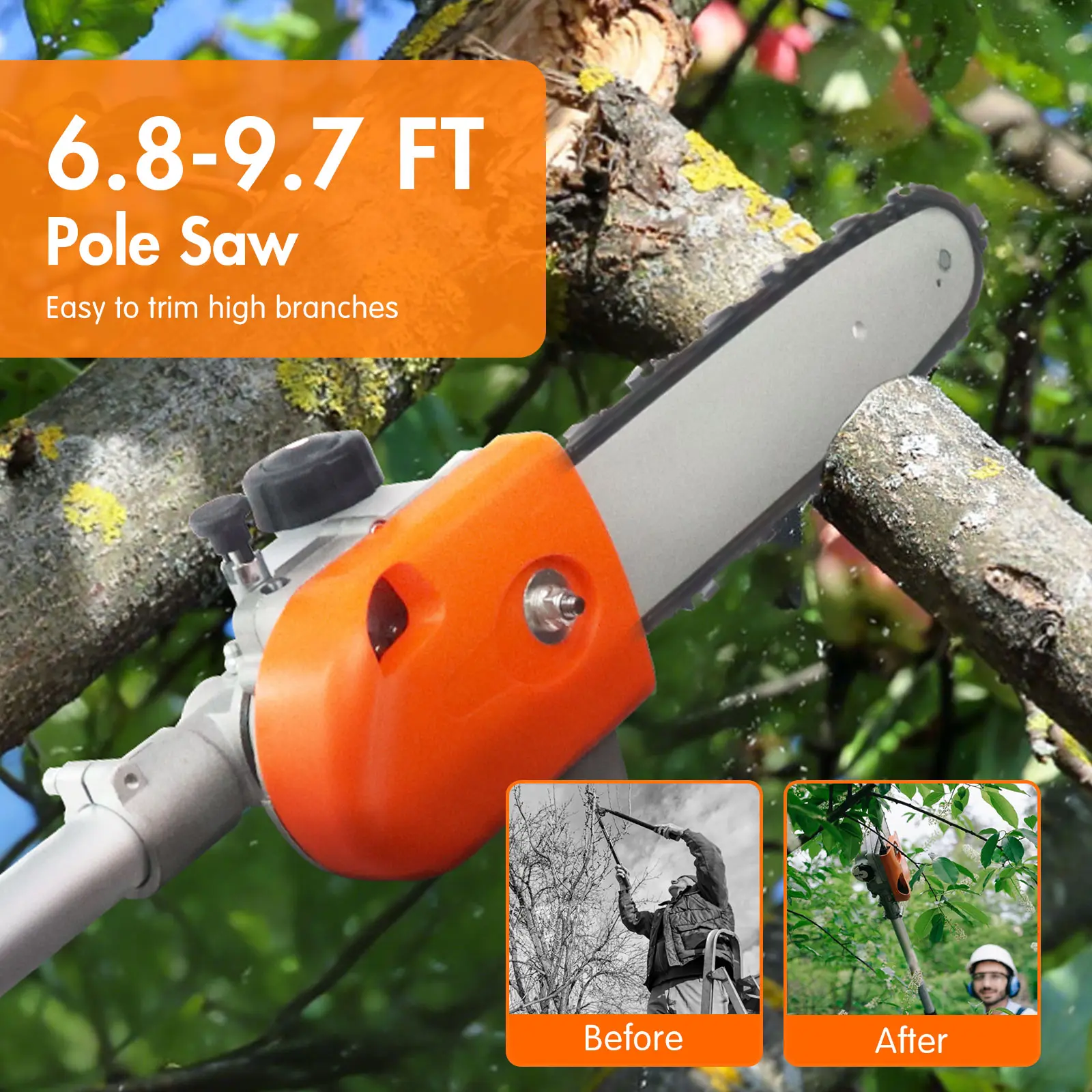The 31.5-inch extension pole allows the gasoline-powered pole saw to be easily adjusted to lengths from 6.9 to 9.5 feet, meeting various working length requirements.
