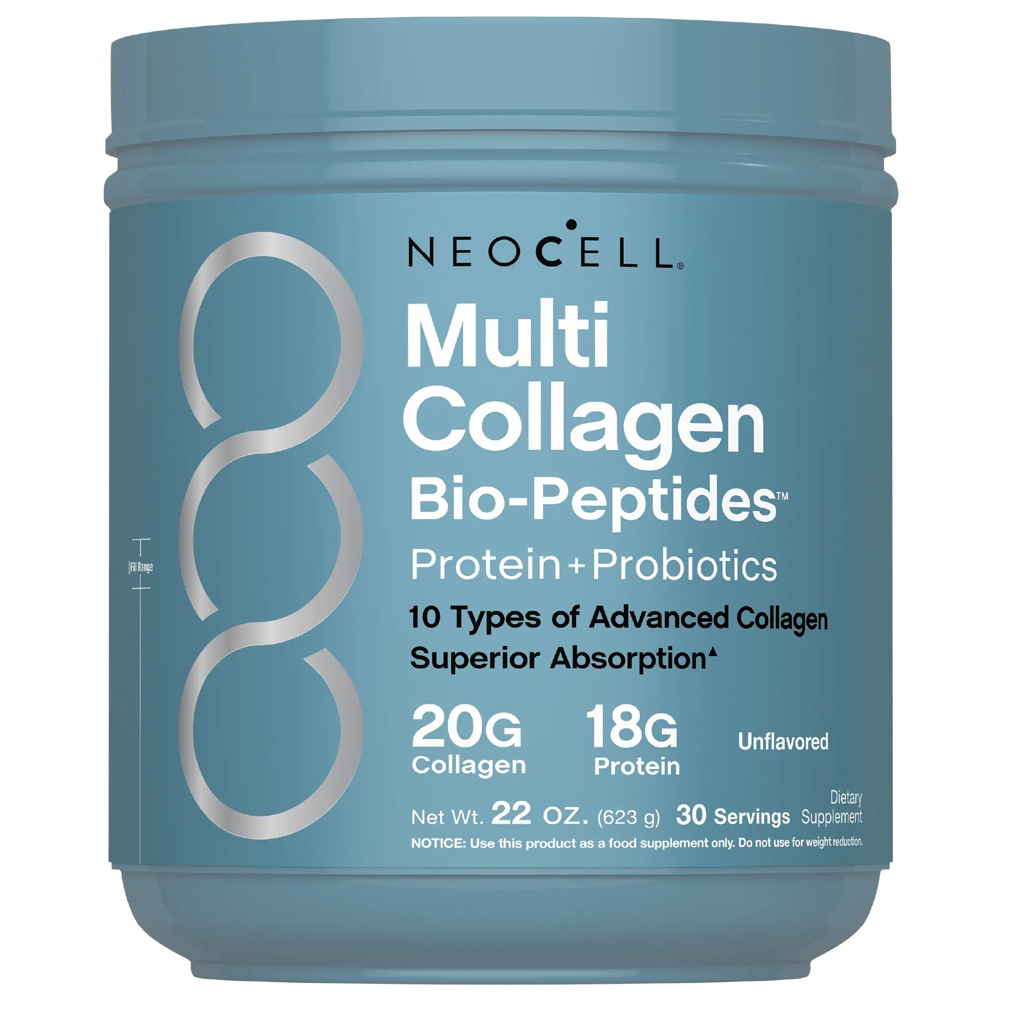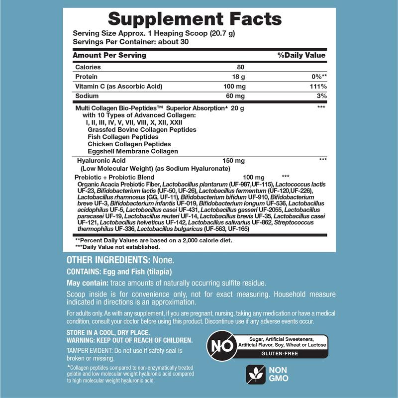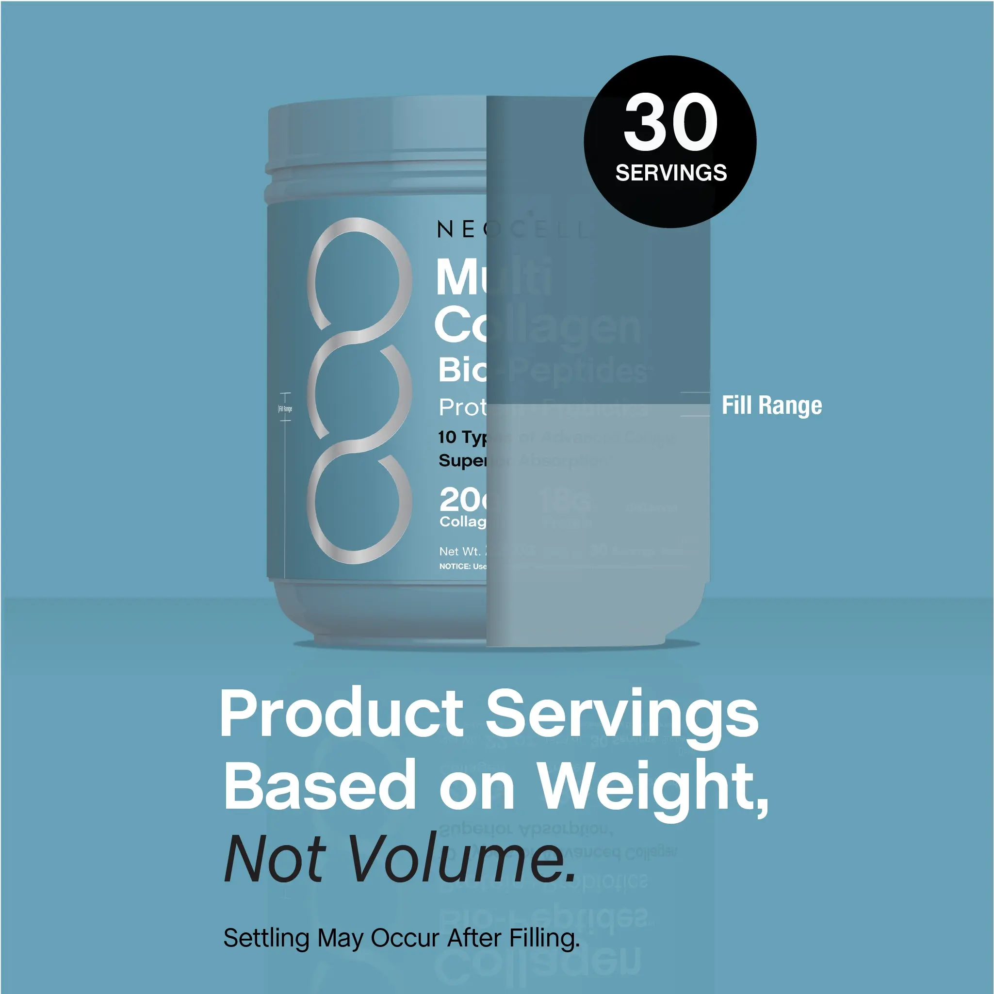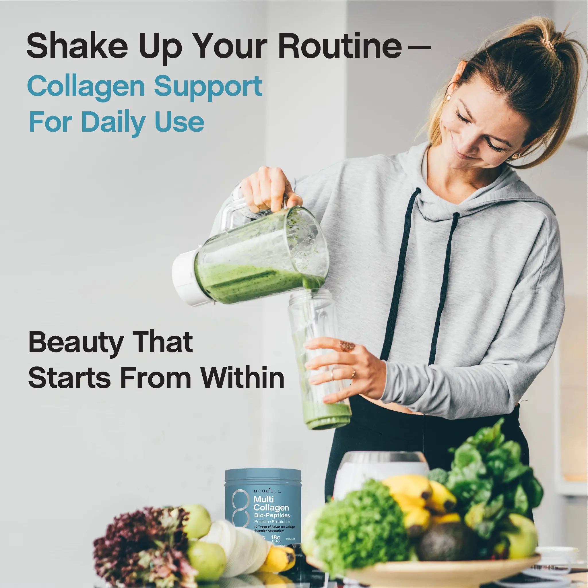 Each scoop of our Multi Collagen Bio-Peptides Protein + Probiotics Powder delivers advanced collagen including 10 different types, vitamin C, Hyaluronic Acid, and Prebiotic + Probiotic blend to support healthy hair, skin, nails, joints, and digestive balance.*