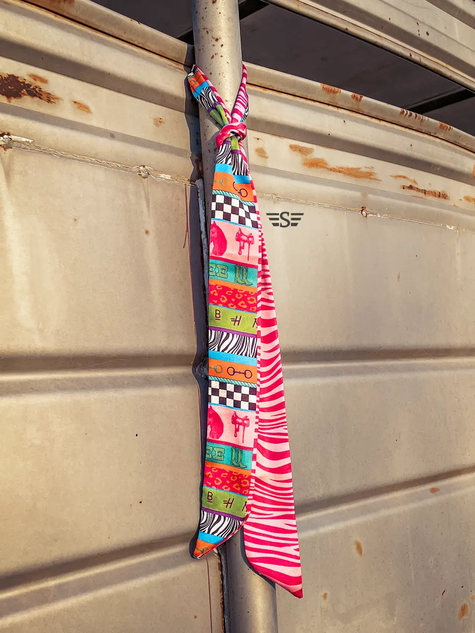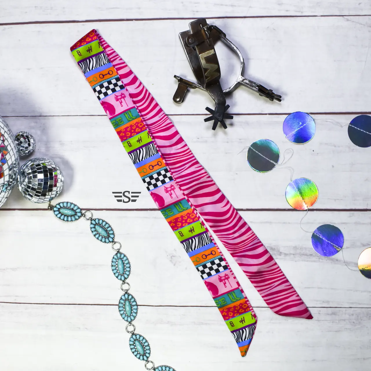 Add a bold pop of western flair with this neon rodeo twilly. Designed with vibrant patchwork patterns featuring bits, boots, and bold prints, this versatile accessory is made to stand out wherever you take it. Tie it on your favorite bag, wrap it around your hat, wear it in your hair, or style it as a neck scarf — the options are endless. Lightweight, silky, and eye-catching, it’s the perfect finishing touch for everyday western style.