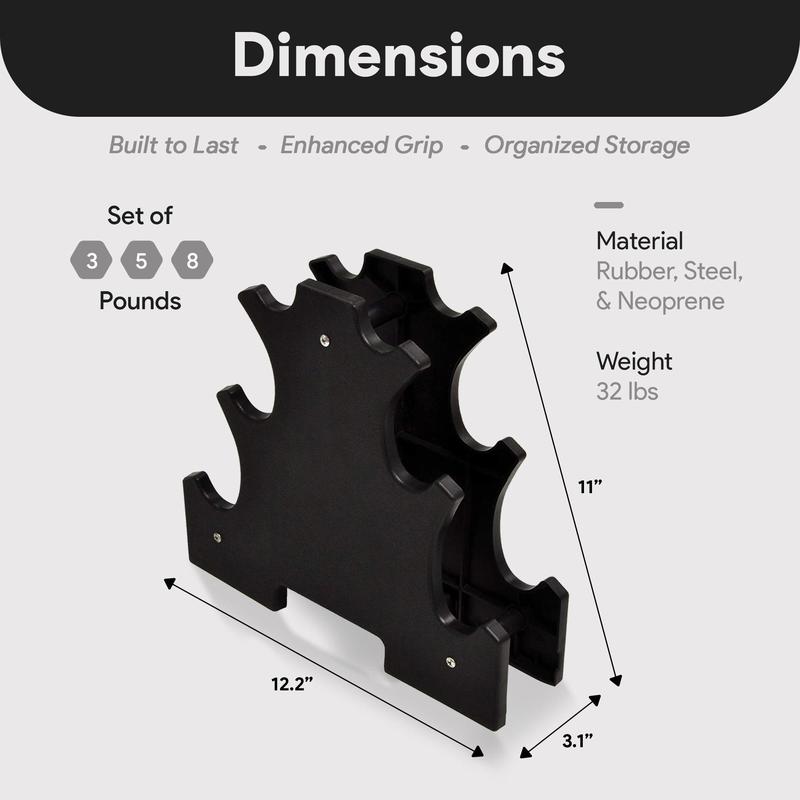 Take your fitness journey to the next level with the BalanceFrom Fitness 32-Pound Neoprene Coated Dumbbell Set with Stand, a comprehensive solution designed to meet all your strength training needs.This exercise set has a total weight of 32 pounds spread across 3 pairs of 3, 5, and 8-pound dumbbells, making it suitable for users of all fitness levels and exercise preferences. Crafted from durable cast iron and coated with durable neoprene, these dumbbells are built to withstand the rigors of both indoor and outdoor workouts. The neoprene coating not only provides a comfortable grip but also ensures enhanced durability and resistance to wear and tear over time. Featuring a hexagonal shape, these dumbbells are engineered to stay in place and stop rolling, providing stability and security during your training sessions. Say goodbye to cluttered workout spaces with the convenient weight stand included in the set, keeping your dumbbells organized and easily accessible whenever you're ready to sweat it out. Assembly is a breeze with the included assembly tool, allowing you to set up your weight stand quickly.Whether you're looking to tone and sculpt your muscles, improve your strength and endurance, or simply add variety to your workouts, the BalanceFrom Fitness 32-Pound Neoprene Coated Dumbbell Set with Stand is your go-to fitness companion.