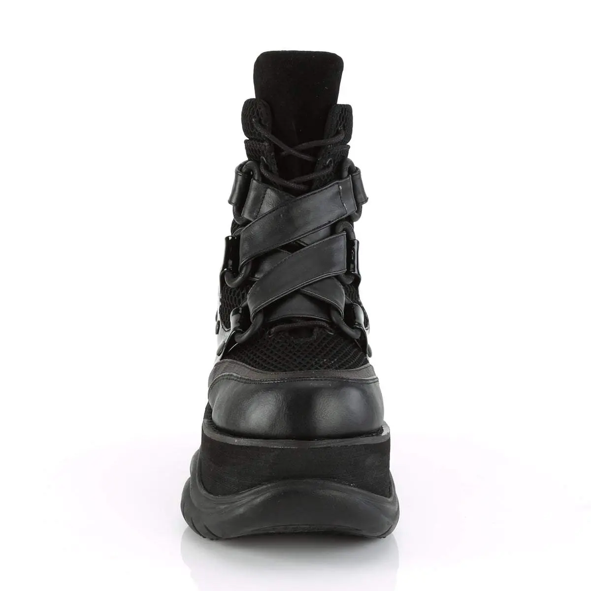 Make a striking statement with the Neptune-126 ankle boots, where urban-chic meets rebel flair. This boot boasts a 3" platform with a lace-up design and eye-catching criss-cross straps secured by a hook n' loop system. Intriguing ventilator details offer an unexpected twist, ensuring you stay cool in more ways than one. The combination of black vegan leather, breathable fishnet, and sleek patent gives a nod to high-fashion with a conscious edge. Finished with a convenient back zip closure, these boots are crafted for the bold at heart.