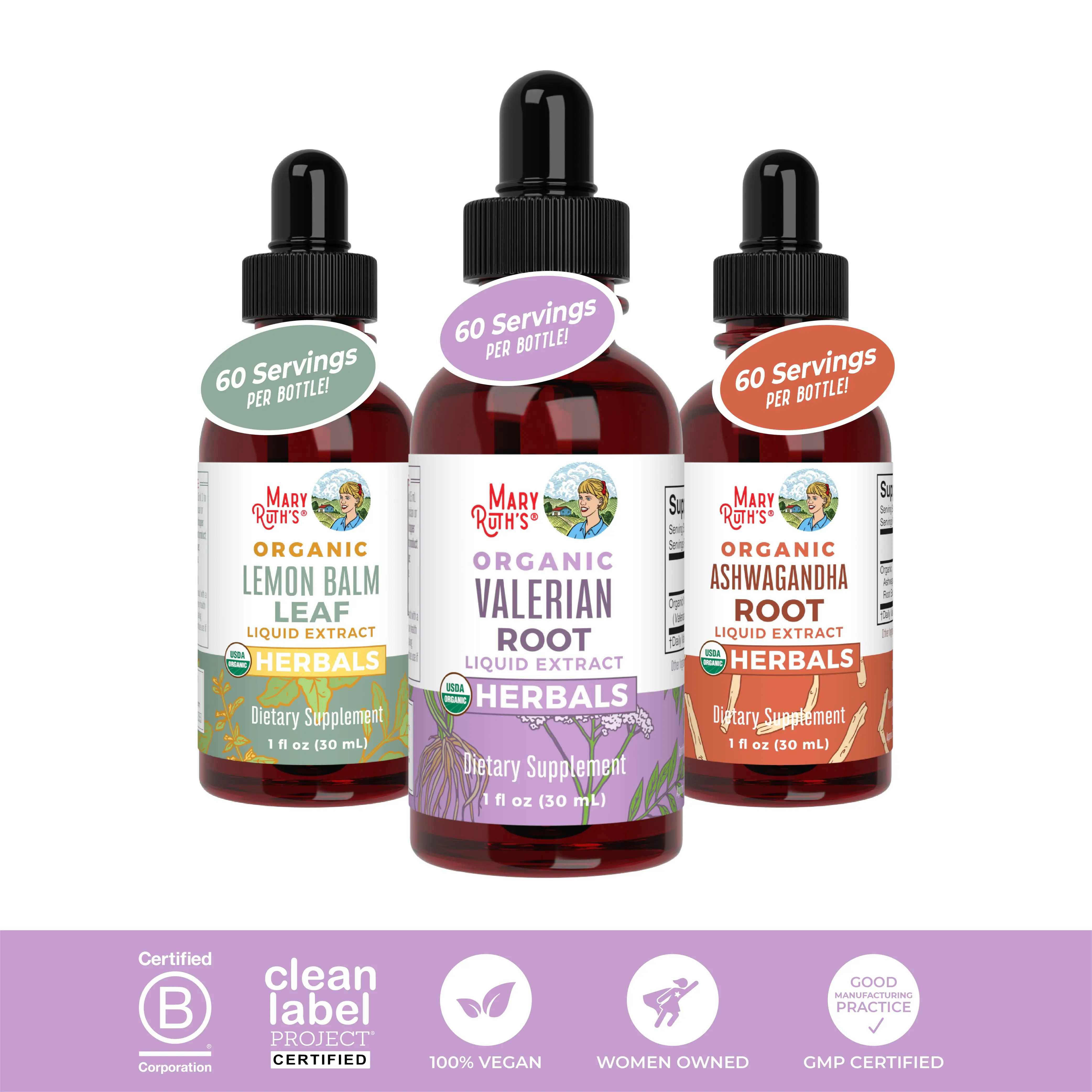 For Most Lifestyles: MaryRuth's Ashwagandha Root Drops USDA Organic, Non-GMO, Vegan, Made in a GMP Facility. Dairy Free, Nut Free, Gluten Free, Soy Free, Sugar Free, No Synthetic or Artificial Colors, Alcohol Free Tincture. Clean Label Project Certified. B Corp Certified.
