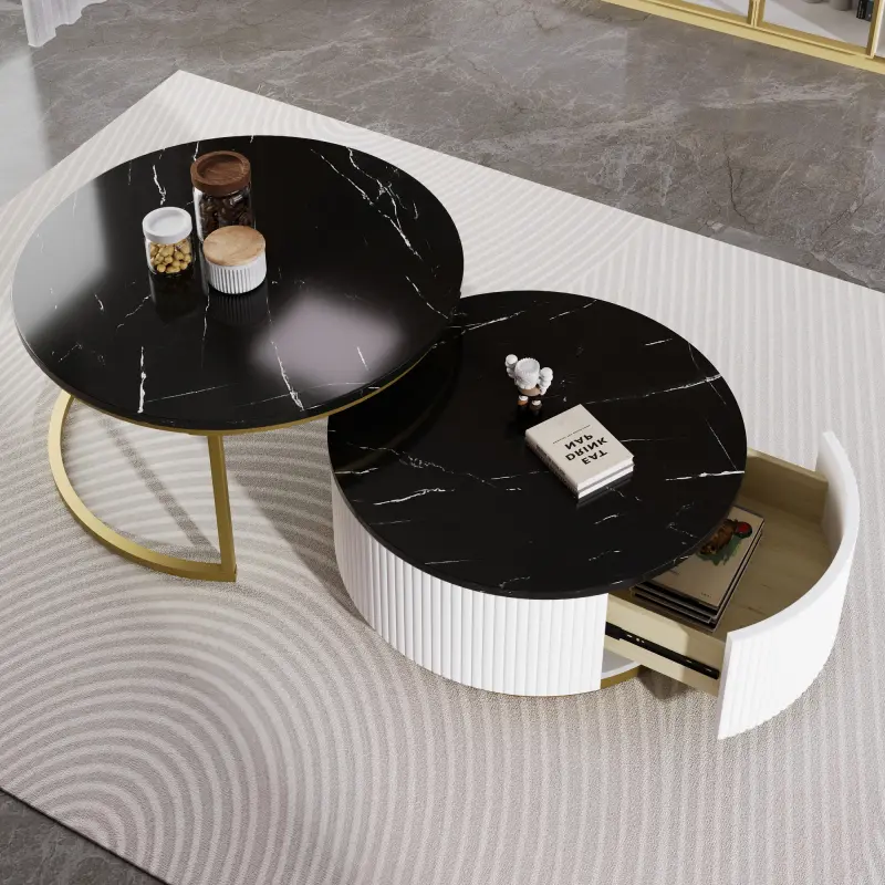 🌟 Modern Round Nesting Coffee Table Fluted with Drawer in Black & Gold in 27.6" 🌟