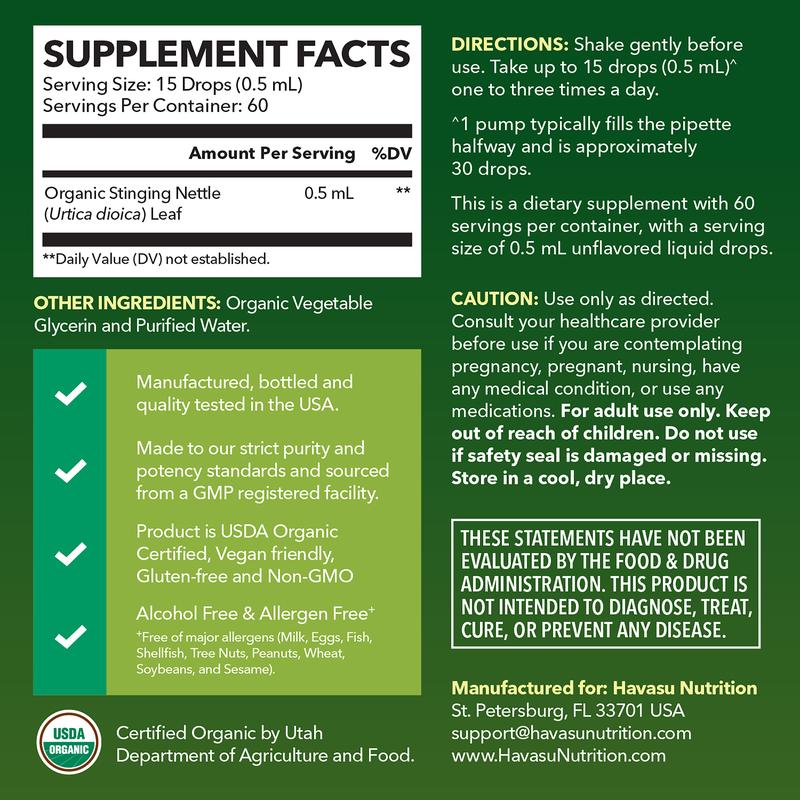 ·Pure and Unflavored: Our organic nettle supplement is unflavored, with no artificial flavors. Enjoy the pure, natural taste of nettle herbal drops in your favorite beverage. We recommend adding 15 drops to a smoothie, directly by mouth, 8oz of water, or your loose leaf tea.