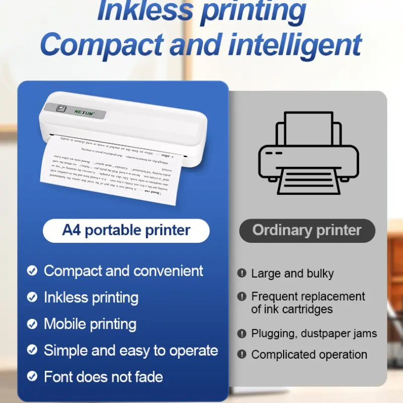 Portable Wireless Inkless Printer, Bluetooth-compatible Thermal Printer Compatible with iOS Android Laptop, Supports Us Letter and A4 Paper