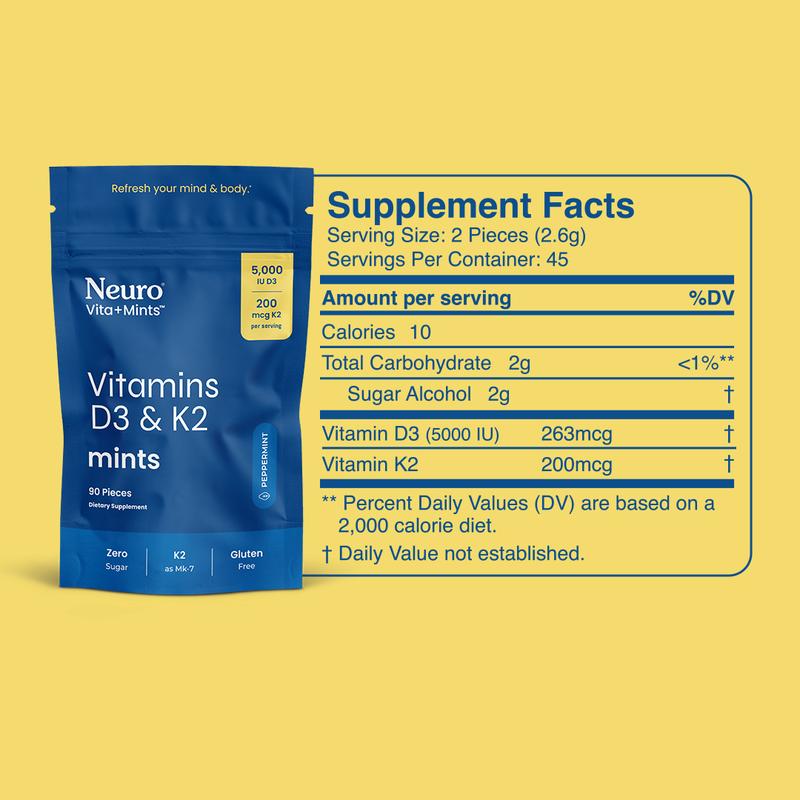 Experience the refreshing burst of Vitamin D3+K2: Refresh your mind & body with a daily mint that does more than freshen your breath. Neuro Vita+Mint D3+K2 delivers essential support for mood, bone, and immune health - all in a zero sugar, aspartame free, gluten free formula made for everyday wellness.