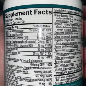 Love this vitamin. Full of good stuff. I split the four caps, two in a. m. two mid-afternoon .