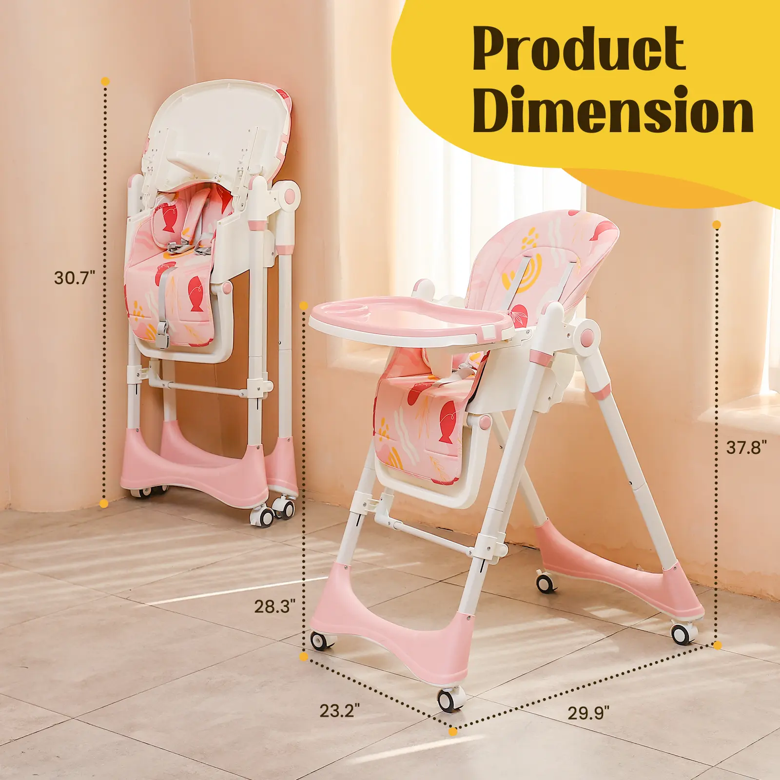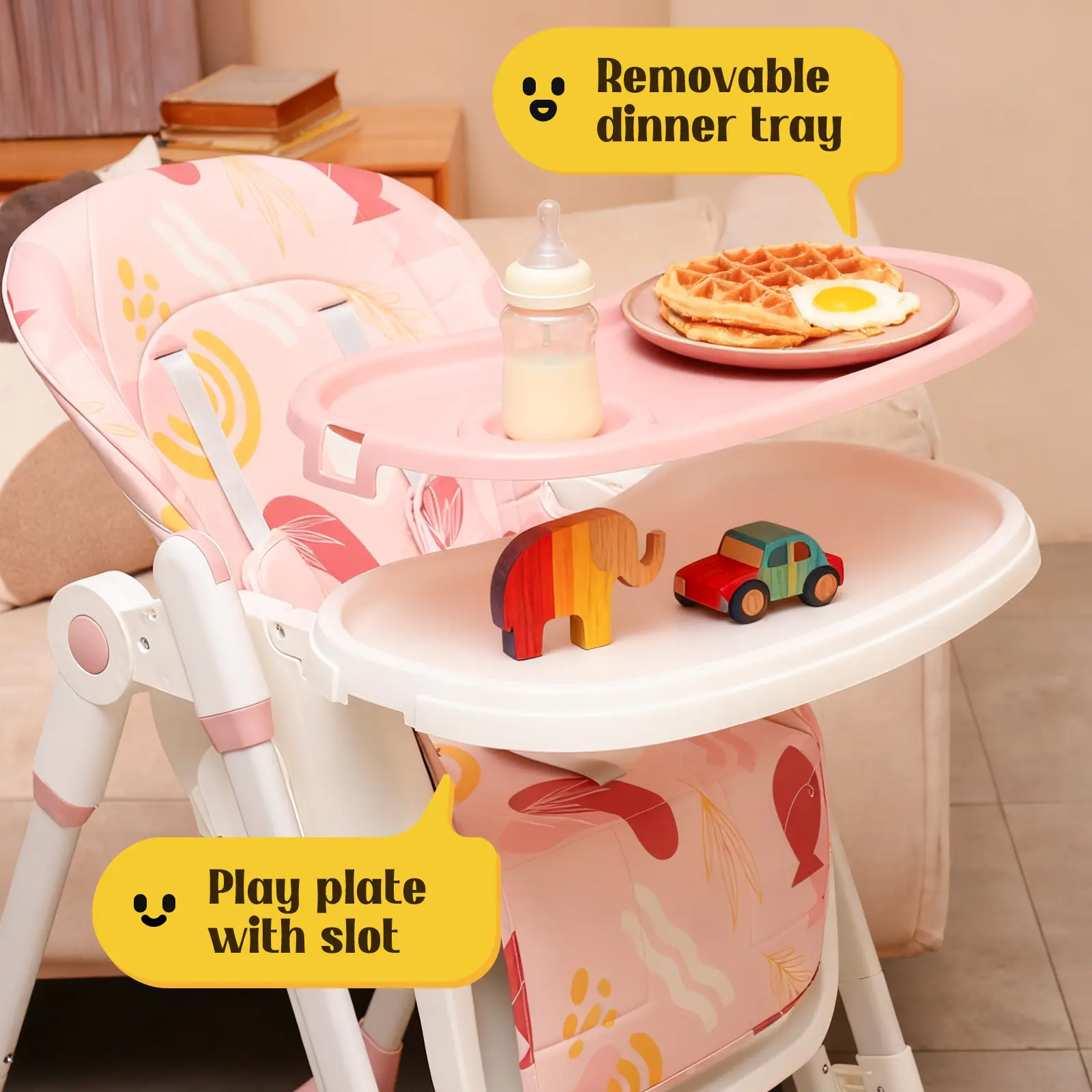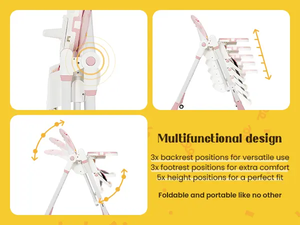 ·High Chair Mode: FDA-compliant dining seat with detachable dual-zone tray (meal/play).