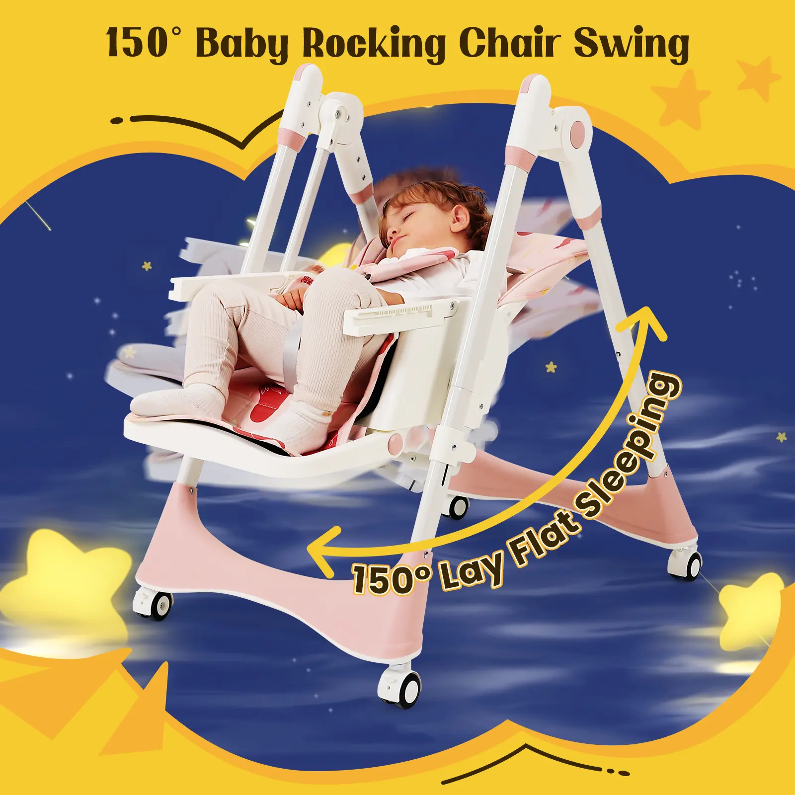 ·Deep-center gravity base + auto-lock brakes ensure safety when baby stands or swings.