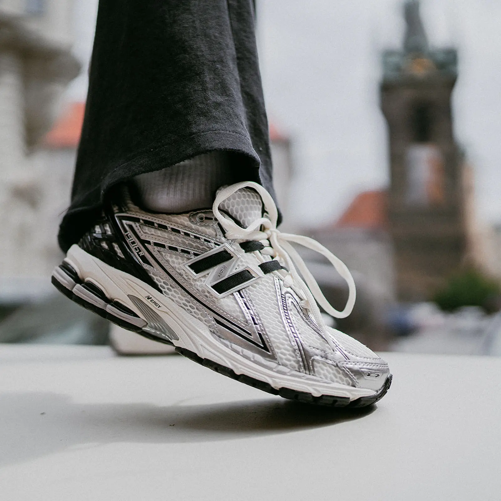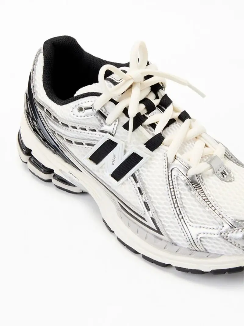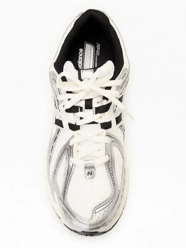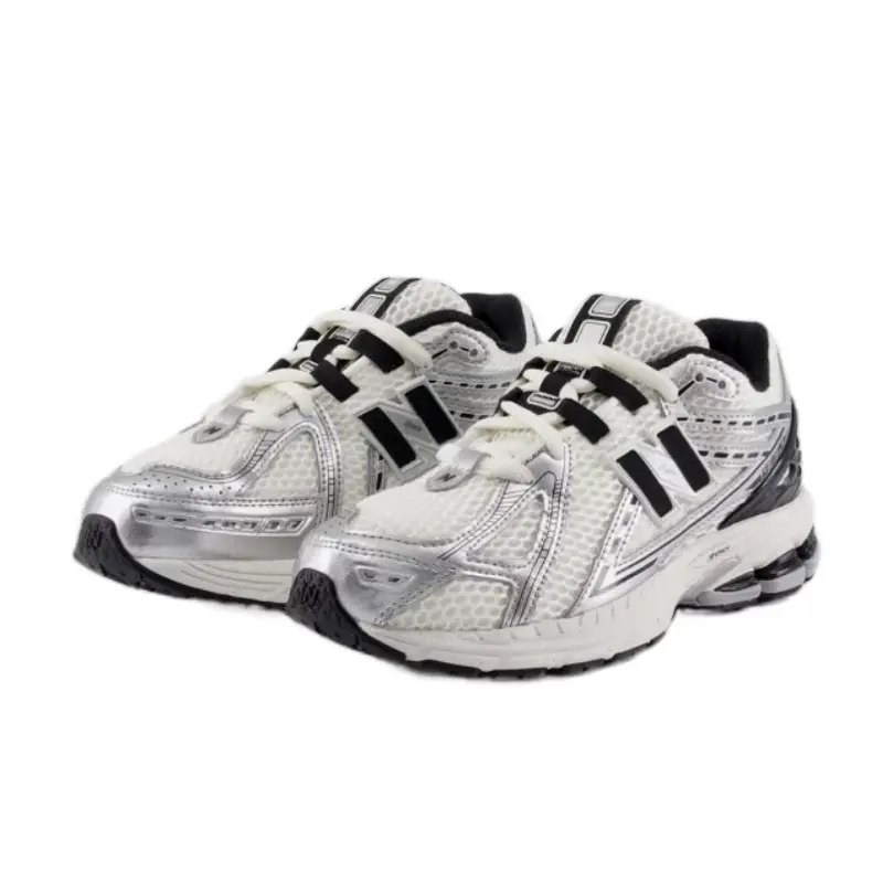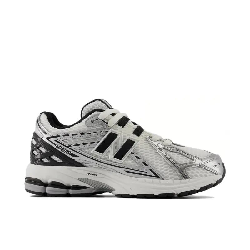The New Balance 1906R Silver Metallic Black (GS) features a breathable mesh upper with metallic silver overlays and black accents. Equipped with ACTEVA LITE midsole cushioning, ABZORB SBS heel cushioning, and a durable rubber outsole, this sneaker offers both comfort and style.