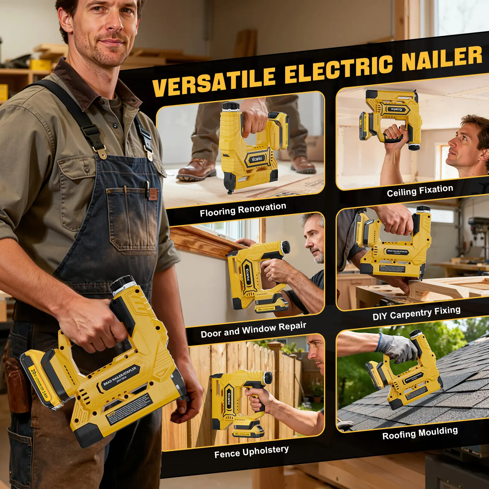 【User-Friendly Design】 - Lightweight and ergonomic, this battery-powered nail gun offers unrestricted mobility. Features a tool-free jam release, LED lights for workspace illumination, and a selectable trigger for sequential or contact actuation modes.