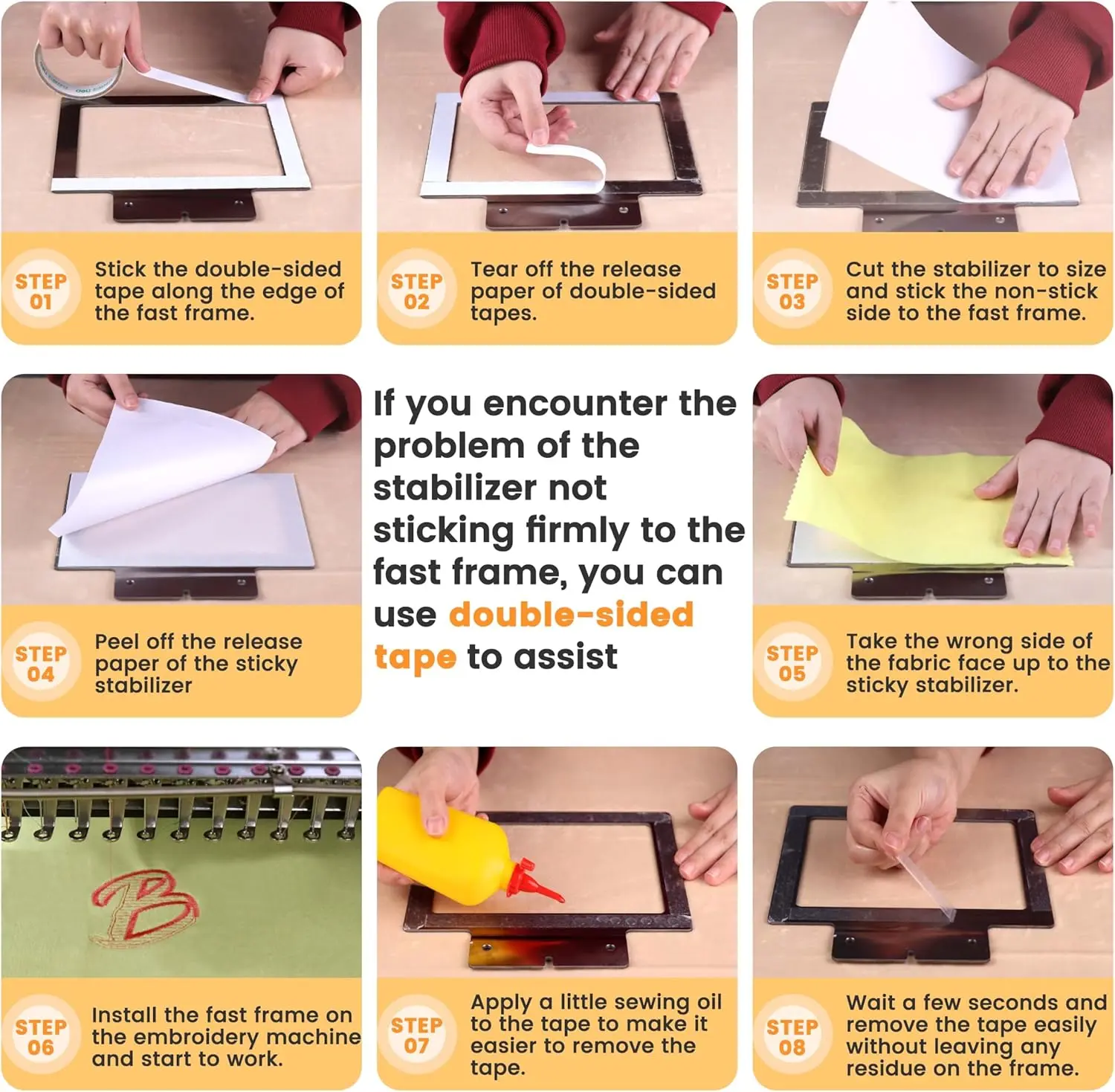 ·Tips for keeping Needles from Getting Gummed up: 1,Slow down the stitch speed to 400spm. High stitch speed will generate more heat to melt the glue, making the needle to be gummy. 2,Rub the needle with Sewer Aid . The recommended is the Organ Anti-glue needle. 4,clean the needle with alcohol usually. 5,follow the correct steps to use sticky embroidery stabilizer(Please refer to the third pic in the description).