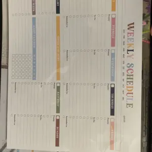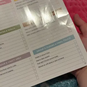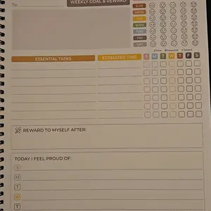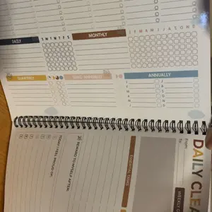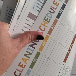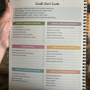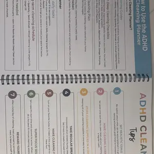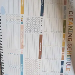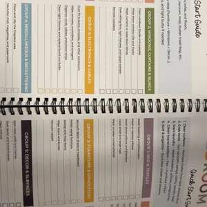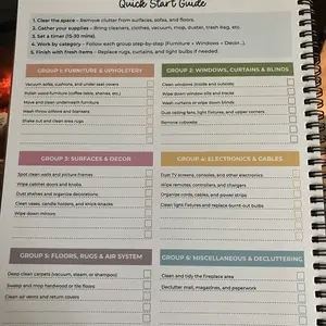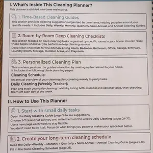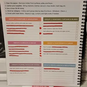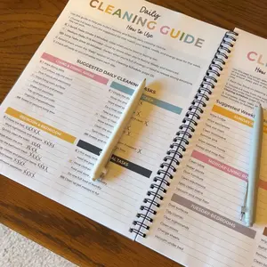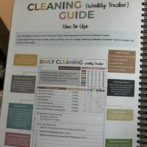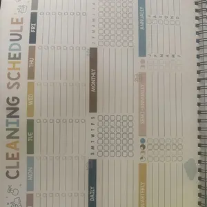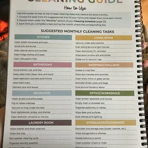 This spiral bound booklet provides structured way on how to schedule for cleaning. Checklist. This helps a person who has a busy mind trying to prioritize where to start. Eight laminated pages that need dry erase marker & approx 50 pages that are colorful and of which are a weekly tracker template.