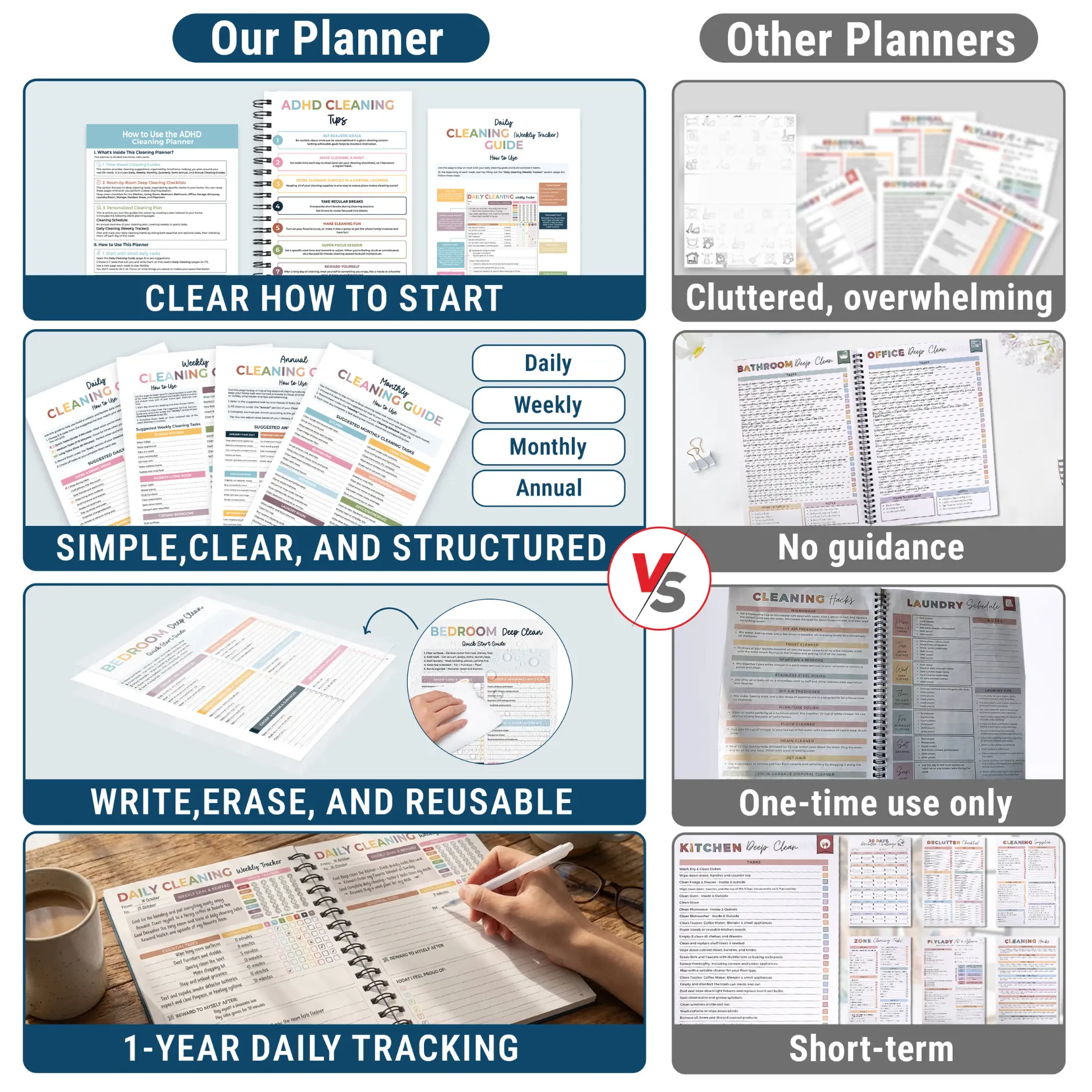 Exactly as you see in the shop…the pages that are reusable are all the deep clean. The pages that are not are just the how to use pages and then the daily/weekly tracker pages. This planner provides a good guide on how to use it.