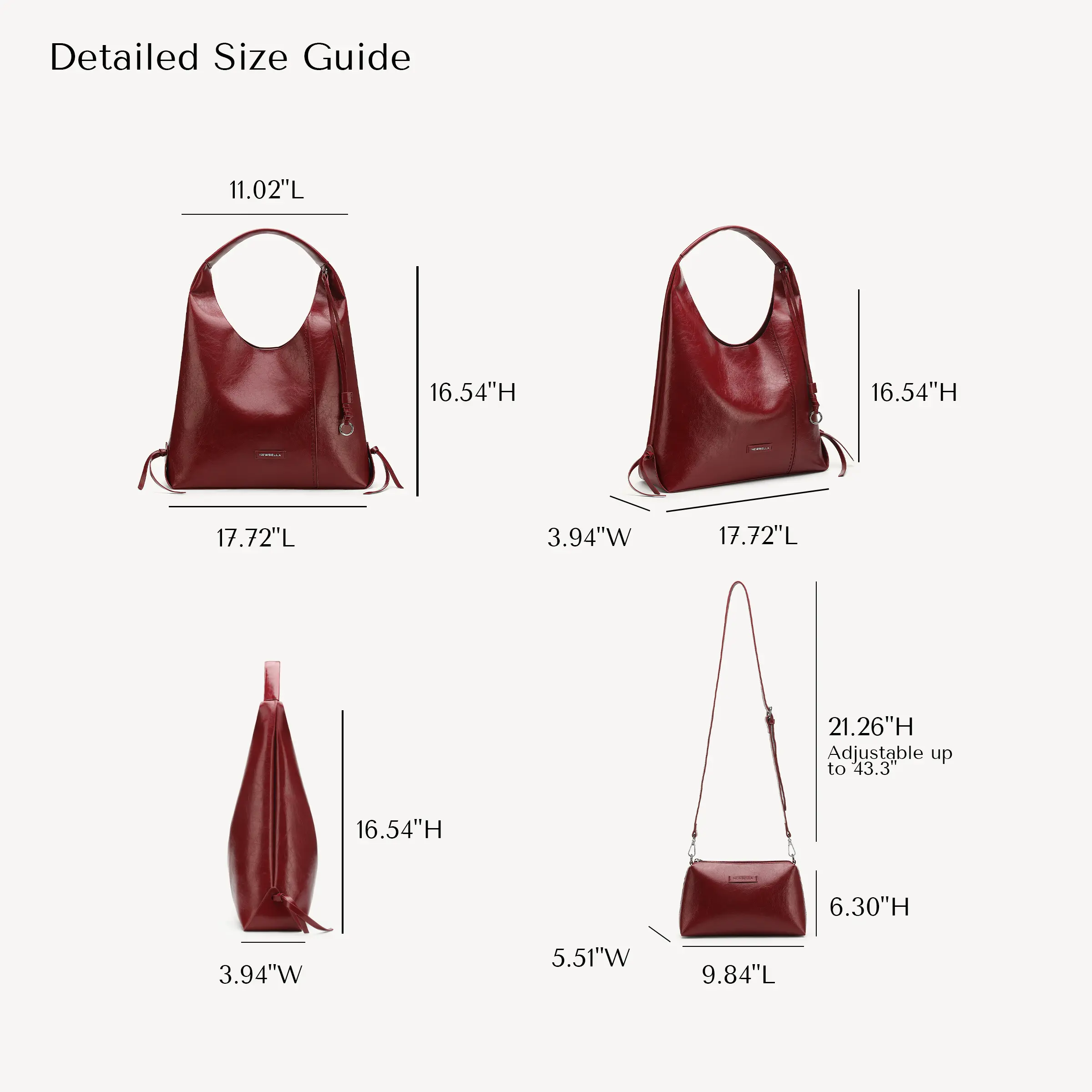✨ Dimensions: Bag: 17.72"L x 3.94"W x 16.54"H. Pouch: 9.84"L x 5.51"W x 6.30"H. Strap: Adjustable up to 43.3", drop 21.26". Handle: Drop 11.02". This set offers a blend of style and functionality for everyday use.