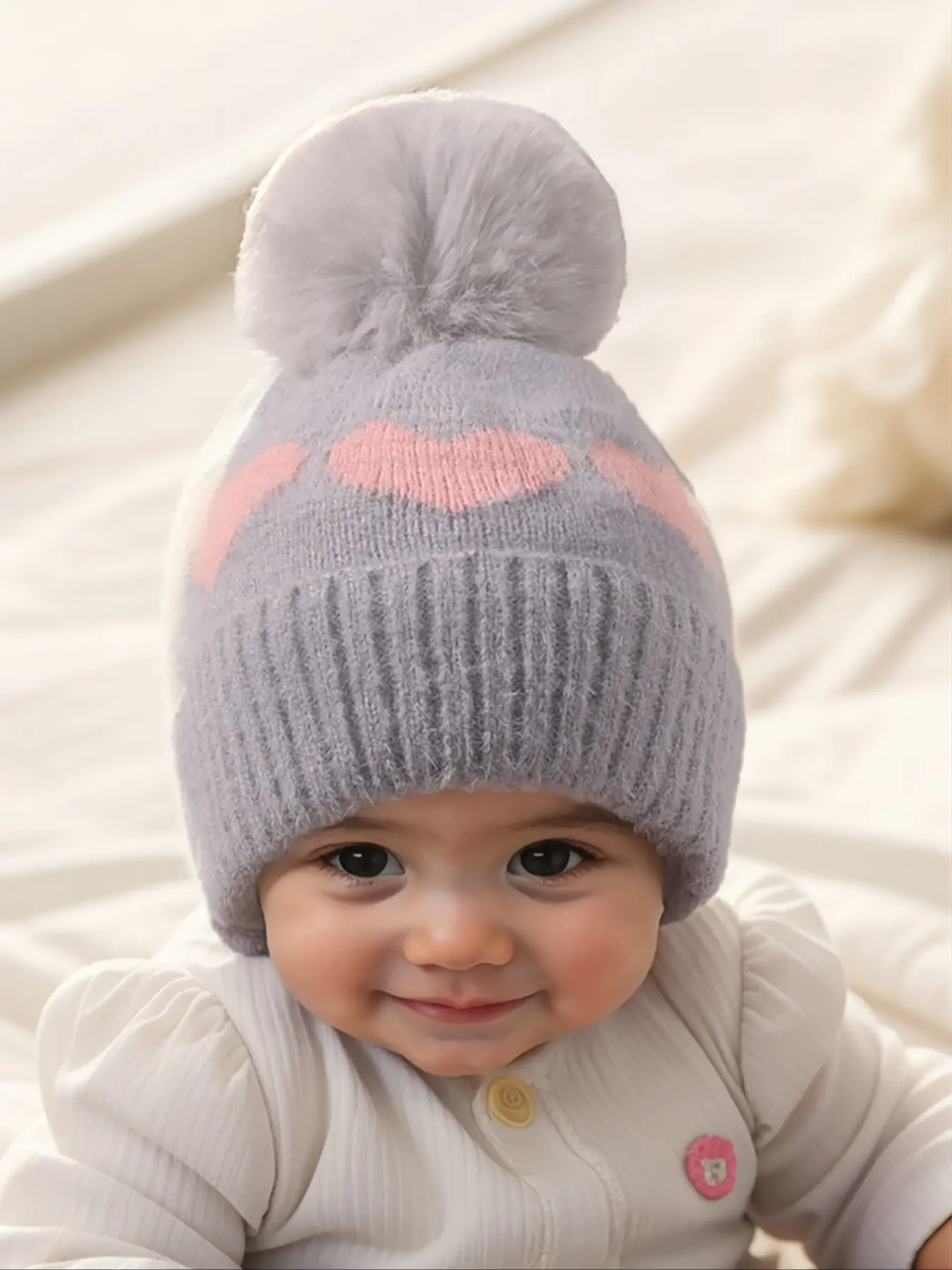 🌟 Fuzzy ball beanie for babies 1-3 years! 💕 Soft and cozy. 👶 #TikTokShopBlackFriday#TikTokShopCyberMonday#spotlightfinds#CuteBabyHats#HeartDesignHats