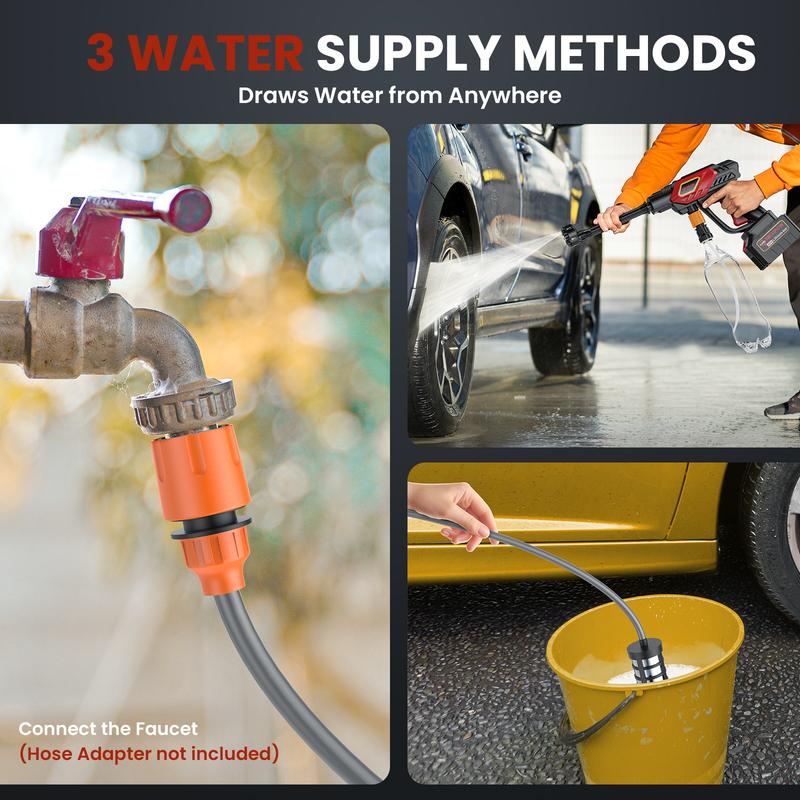 ·DRAWS WATER FROM ANYWHERE - Draw water from any fresh water source with the included water hose, or connect to your garden hose. And 32.8ft hose with water filter can effectively filter impurities, particles, waste leaves or sludge, better protect our water pressure machine. Additionally, the high-quality water hose is pressure-resistant and durable.