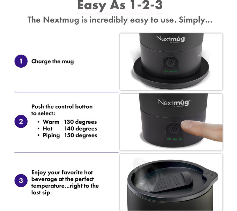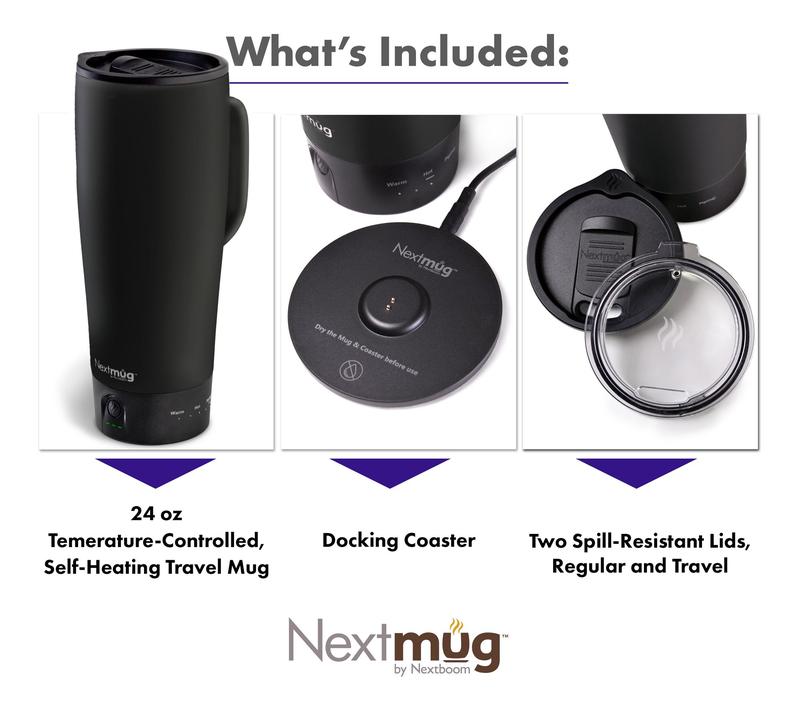 The Nextmug Ultra comes with a Docking Coaster that charges the mug. To use, insert power adapter into a standard 120 volt wall outlet and plug power cord into the docking coaster. Dry mug thoroughly before charging. When fully charged, your mug will maintain its teperature for up to several hours while undocked. To enjoy your mug for longer periods of time, use continuously with the docking coaster. COO: China Includes: 24-oz Mug, Docking coaster, Charger