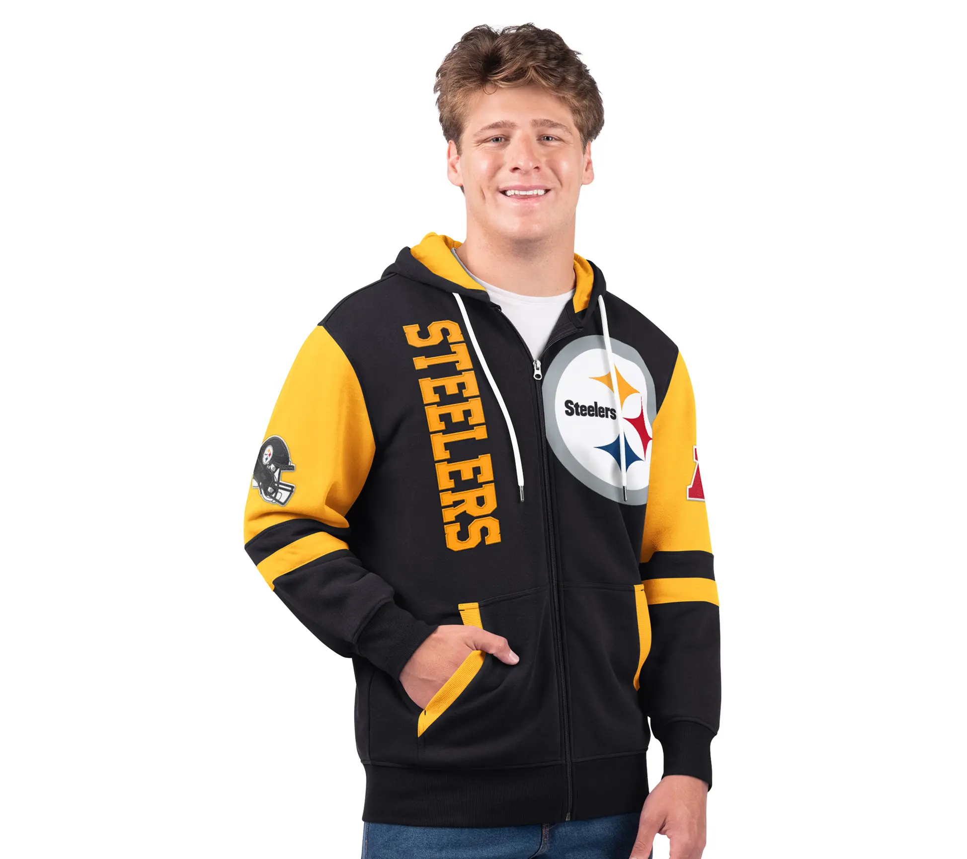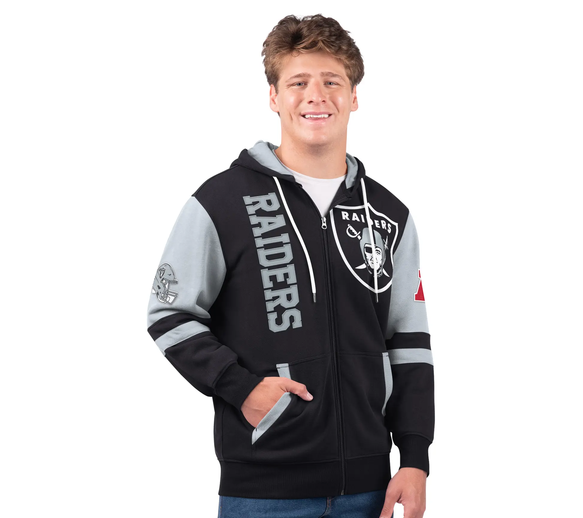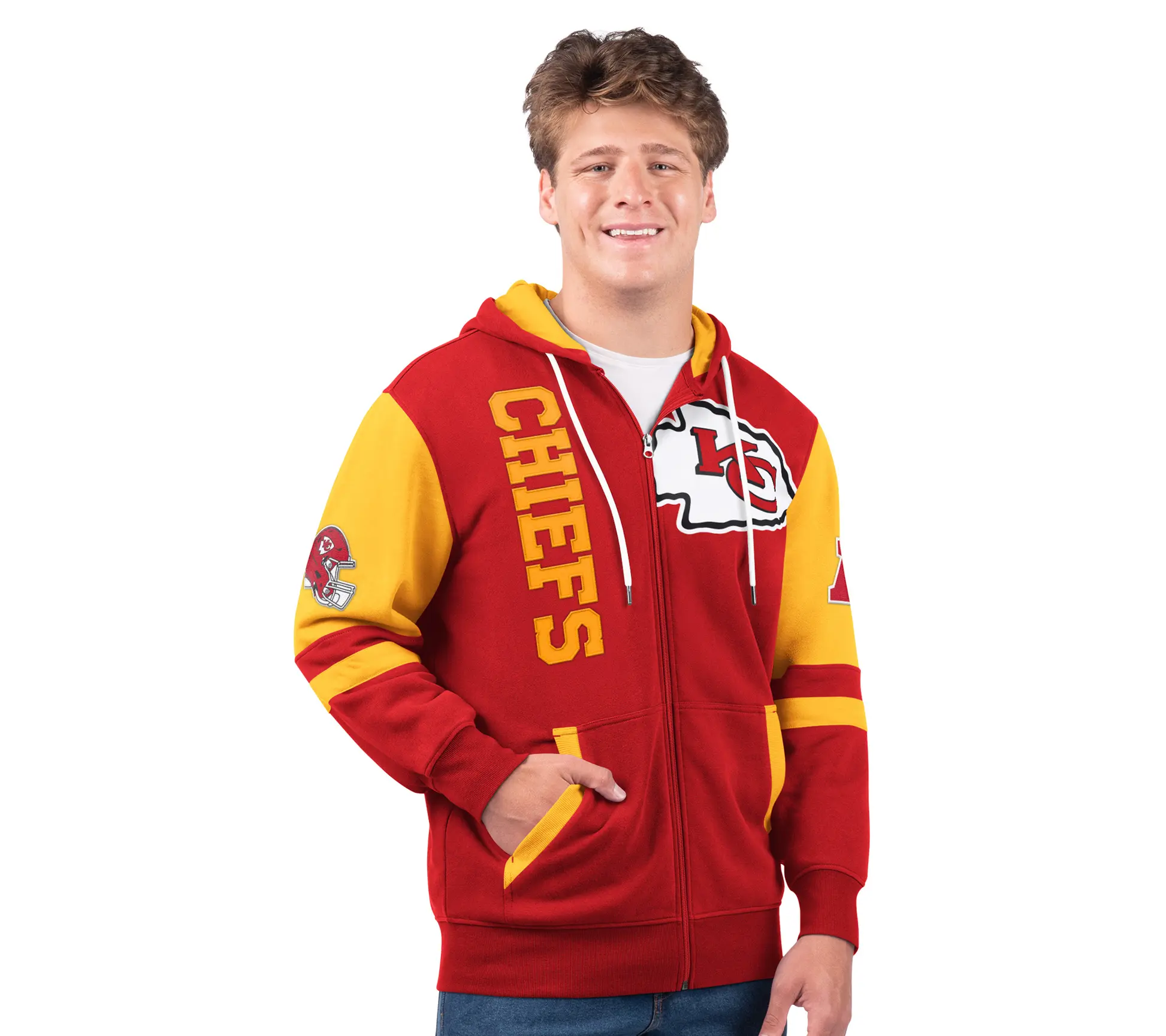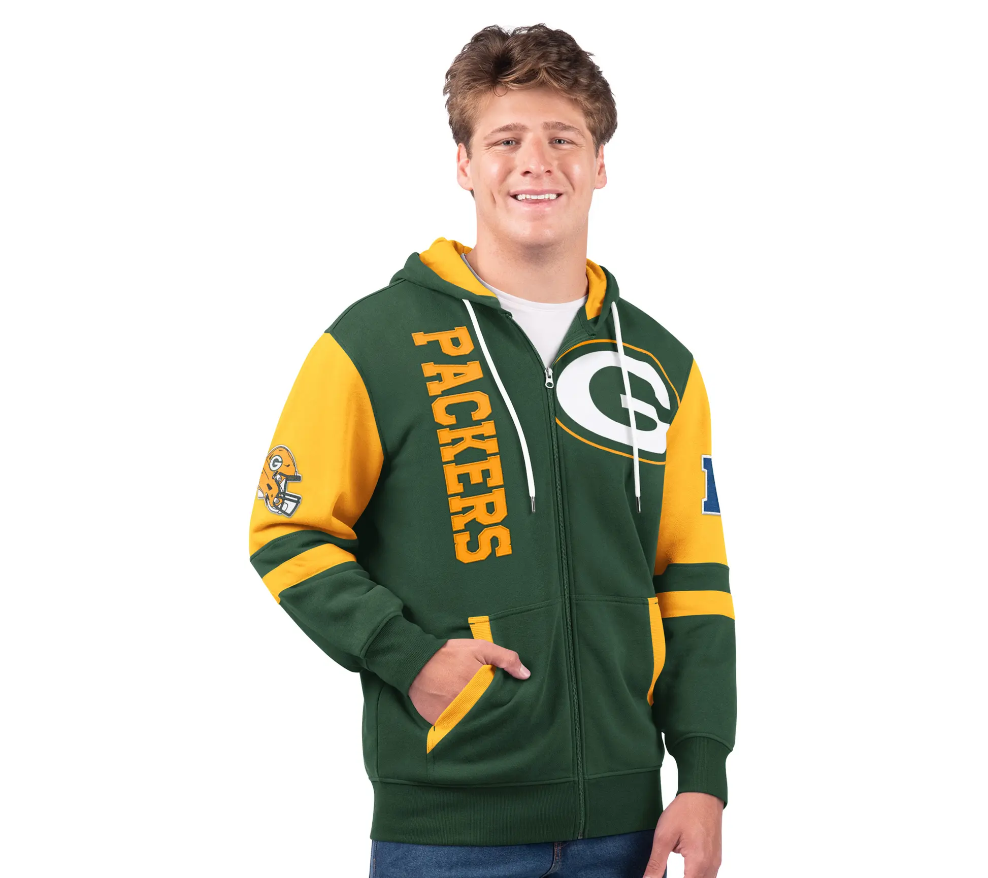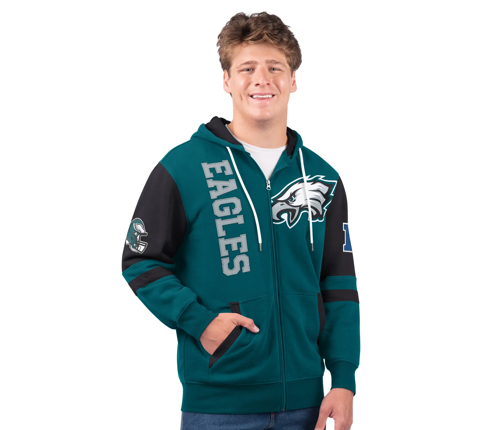 ·Features: primary team color body; secondary team color on long sleeves, side pockets, and hood interior; oversized team logo on left chest; twill tackle helmet and conference adoption details on sleeves