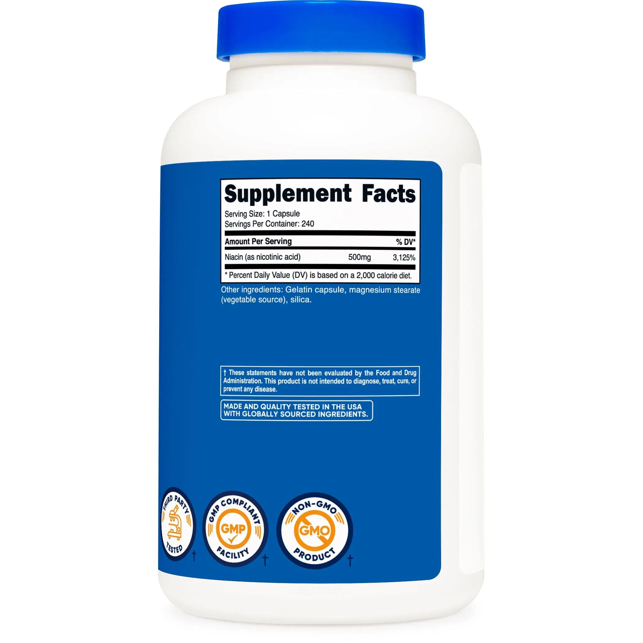 Each bottle contains 240 capsules of high-quality 500mg of Niacin. Please be aware that taking high dosages of this Niacin version of Vitamin B3, especially when your body is not used to it, can lead to what is often referred to as the "Niacin flush." A "niacin flush" is a common temporary side effect of taking niacin some experience; it's also a protocol used by some physicians.