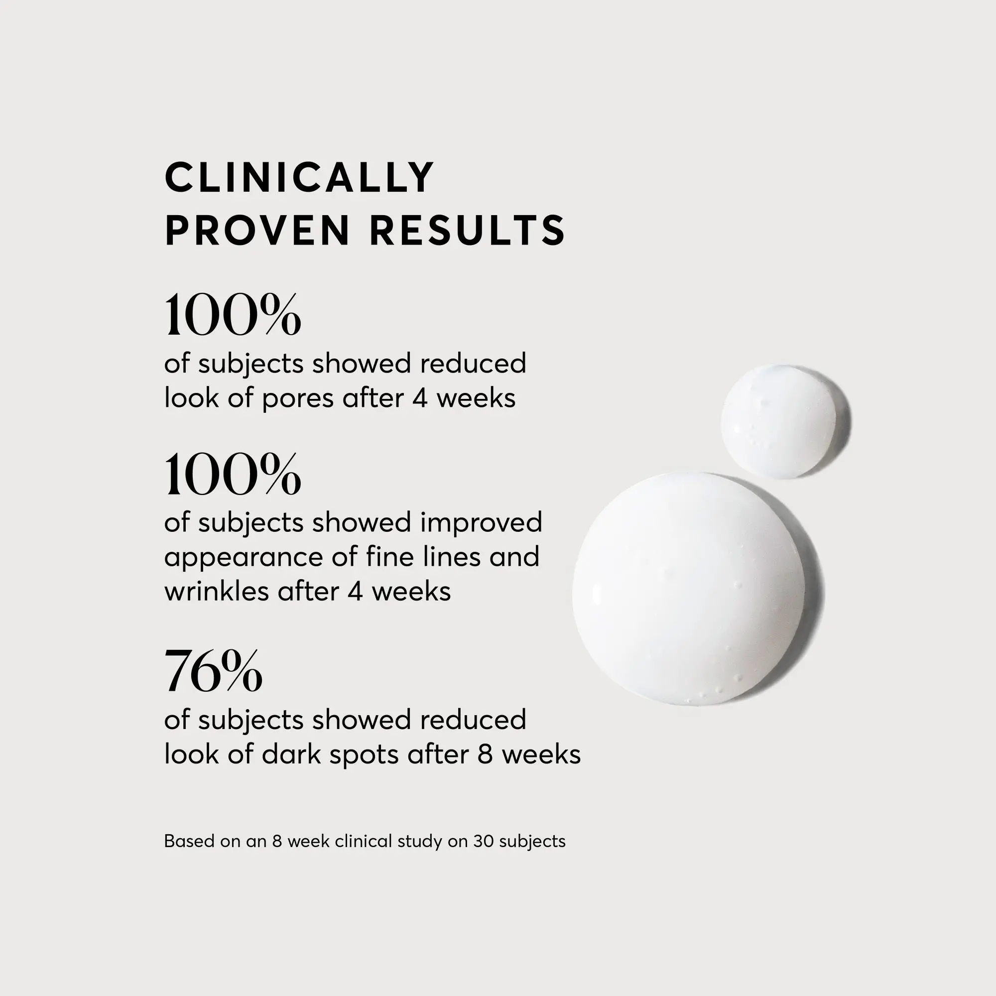 Our concentrated serum is formulated with pure 12% niacinamide and 2% zinc PCA, and is clinically proven to reduce the appearance of dark spots, pores, plus fine lines and wrinkles.*