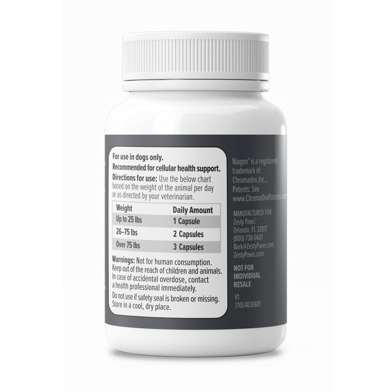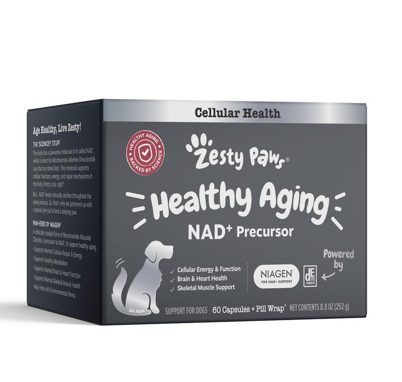 Healthy Aging, Zesty Life! – Zesty Paws NAD+ Precursor Supplement includes 60 mg of Niagen (per capsule) to support your dog's health as they age.