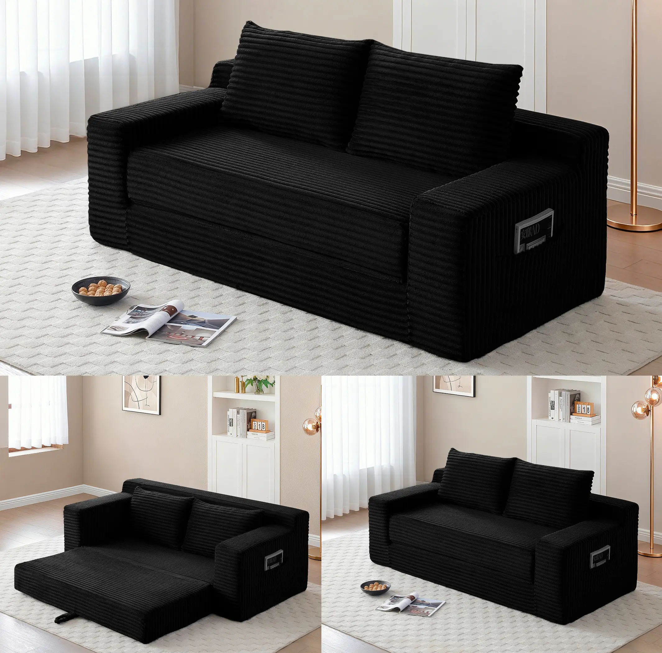 This sofa features a pull-out bed, convertible with a hand strap. It functions as a comfortable sofa by day and a convenient bed by night. Ideal for hosting guests and small living spaces. The corduroy boneless cloud couch design with high-density foam filling ensures ultimate relaxation. No frame for a cozy lounge experience.