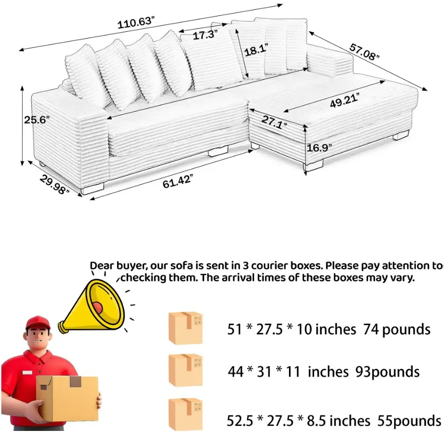 Ordered late night Saturday/early Sunday and all three pieces showed up by Thursday!! Packages aren’t super heavy but not easy peasy to do quickly and alone. If you can have a helping hand, the assembly is super easy but it is doable by yourself as well. Super comfy n cozy after a month of use!!