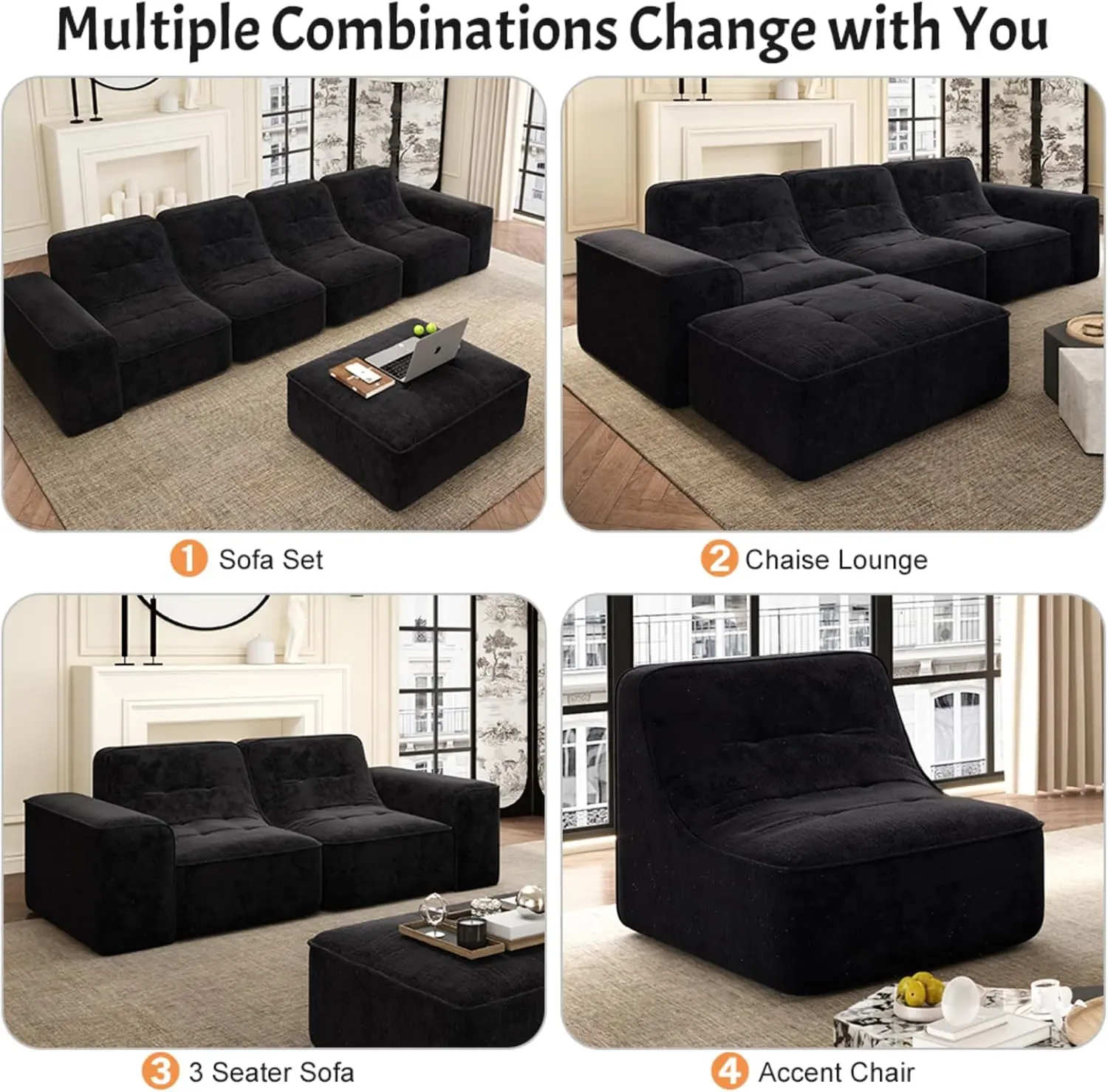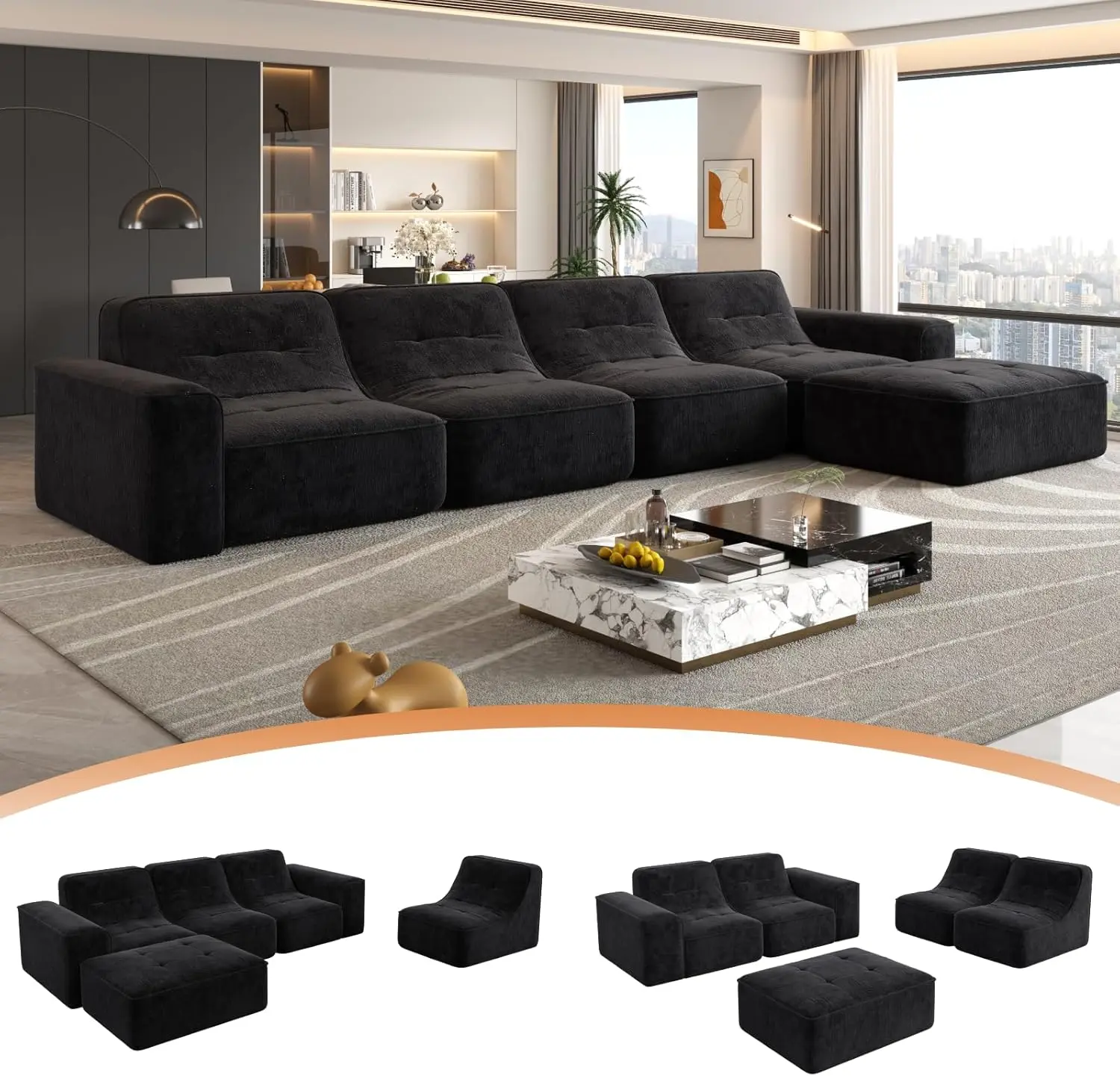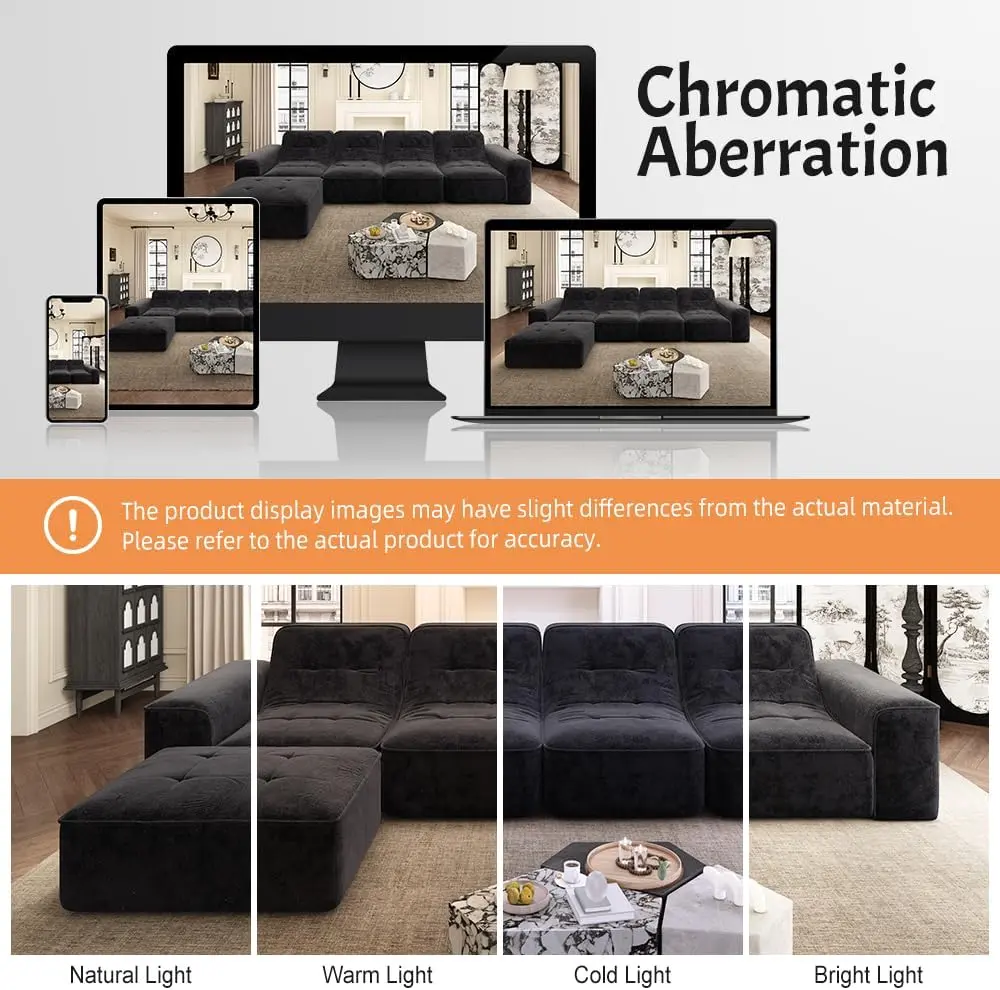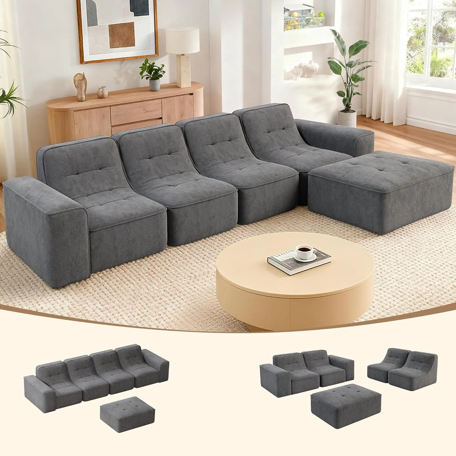Modular Sectional Boneless Sofa- Movable Ottoman: Offers free matching options as a sofa set, 3-seater sofa, 5-seater sofa, chaise lounge, accent chair, etc.- Modern Simplicity: Integrates modern simplicity and creative home style, enhancing spatial style and design sense.