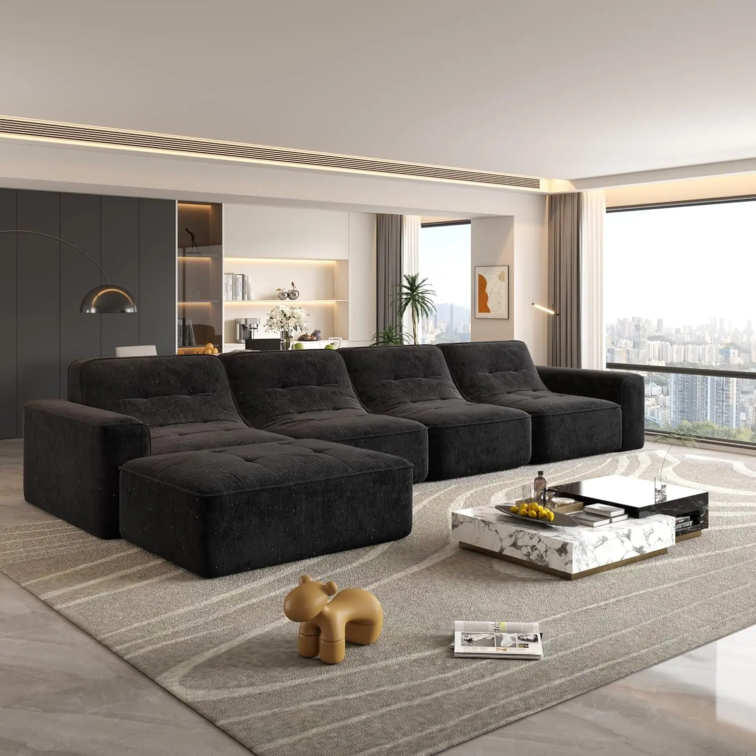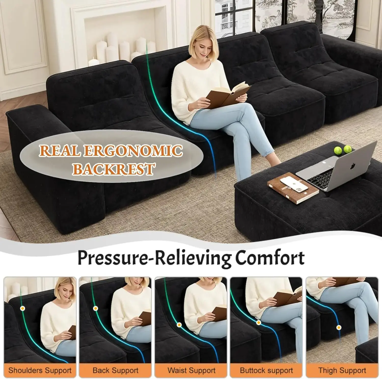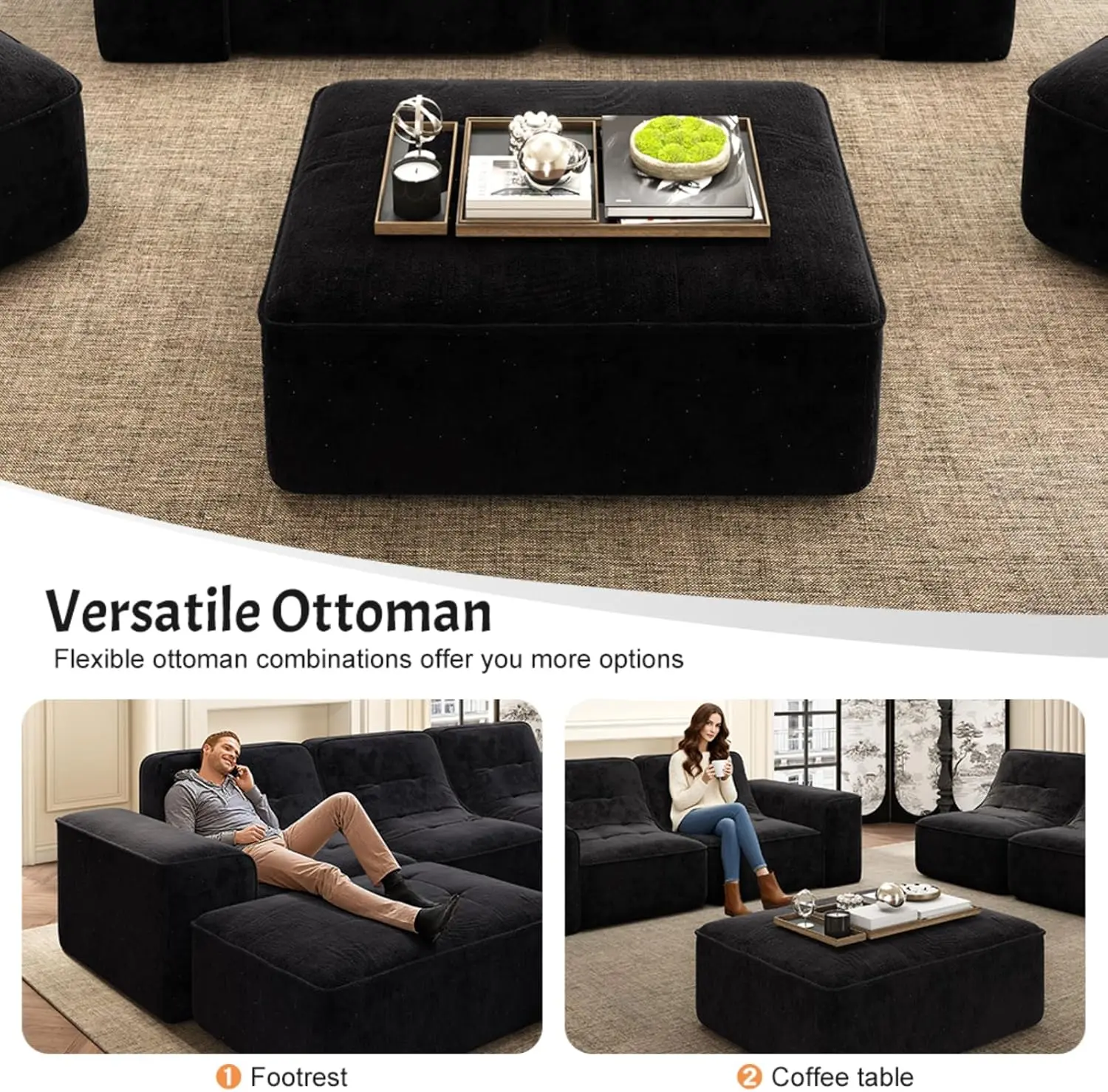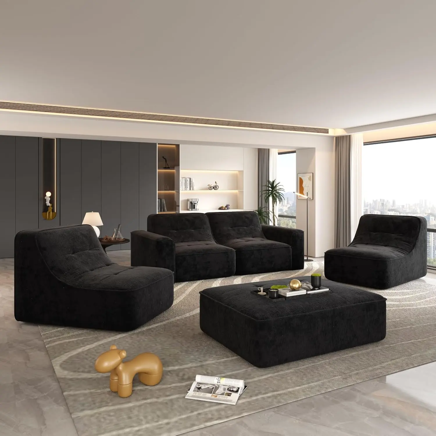 Modular Sectional Boneless Sofa- Movable Ottoman: Offers free matching options as a sofa set, 3-seater sofa, 5-seater sofa, chaise lounge, accent chair, etc.- Modern Simplicity: Integrates modern simplicity and creative home style, enhancing spatial style and design sense.