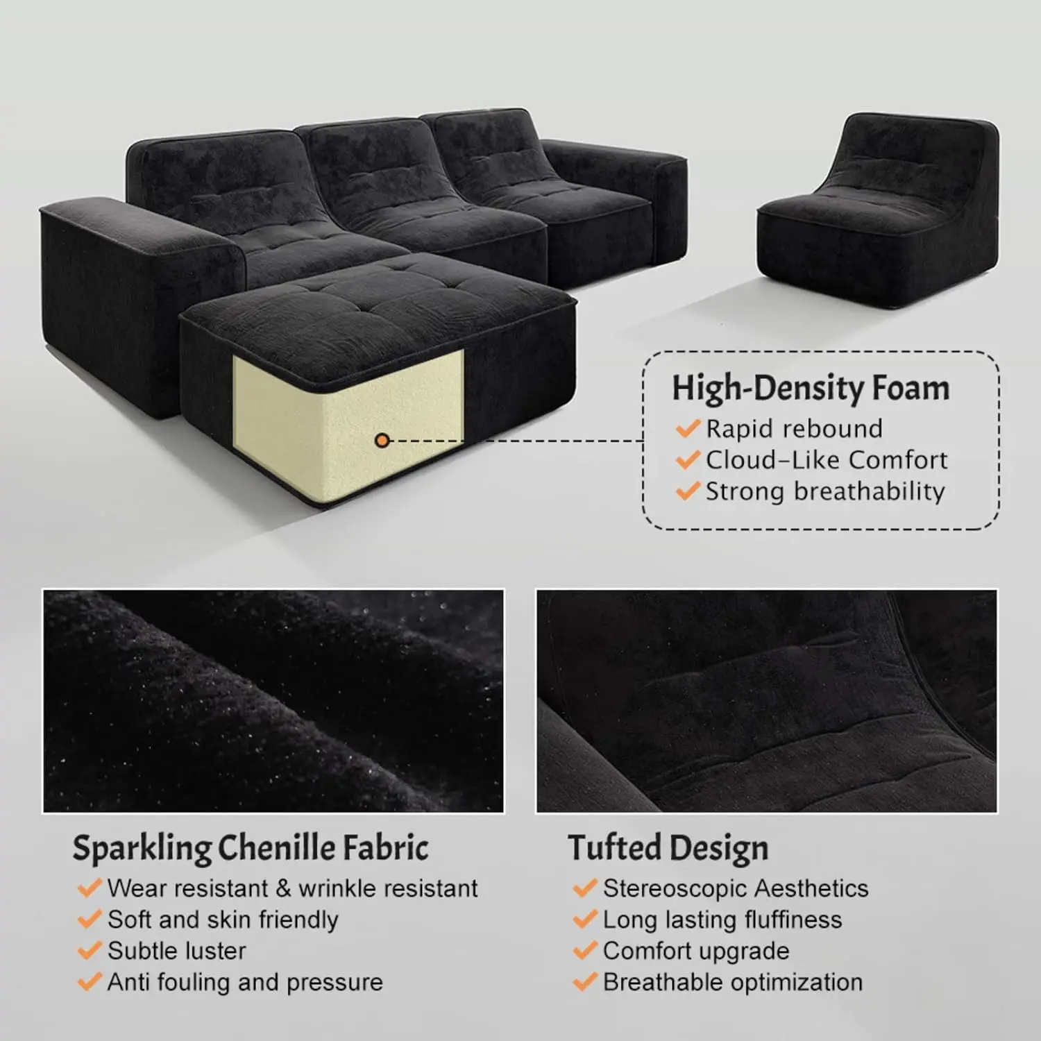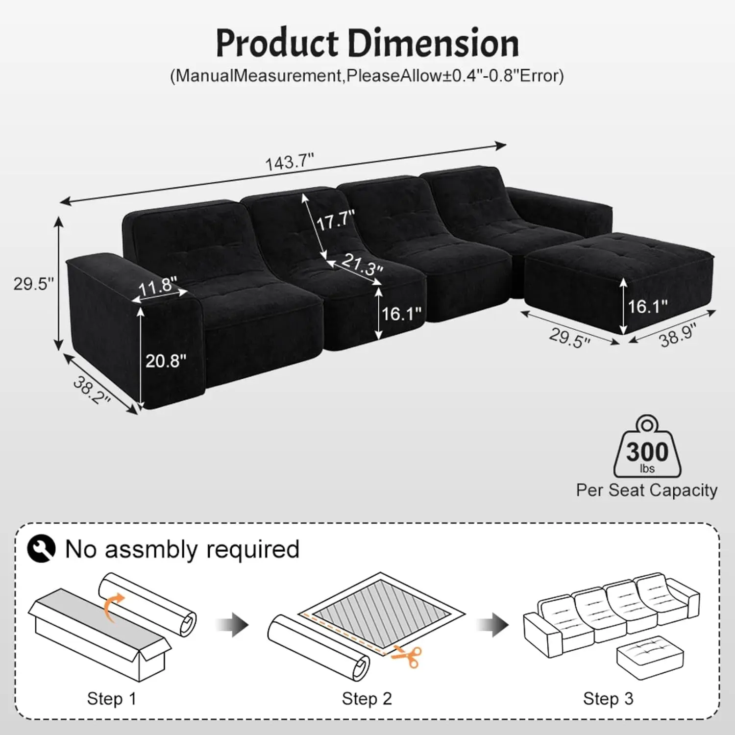 Specifications- Size: 143.7"- Components: 4 Seat + 1 Ottoman- Material: Luxury Sparkling Chenille Fabric- Design: Modular, Ergonomic, Comfortable