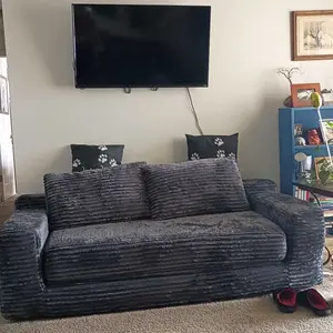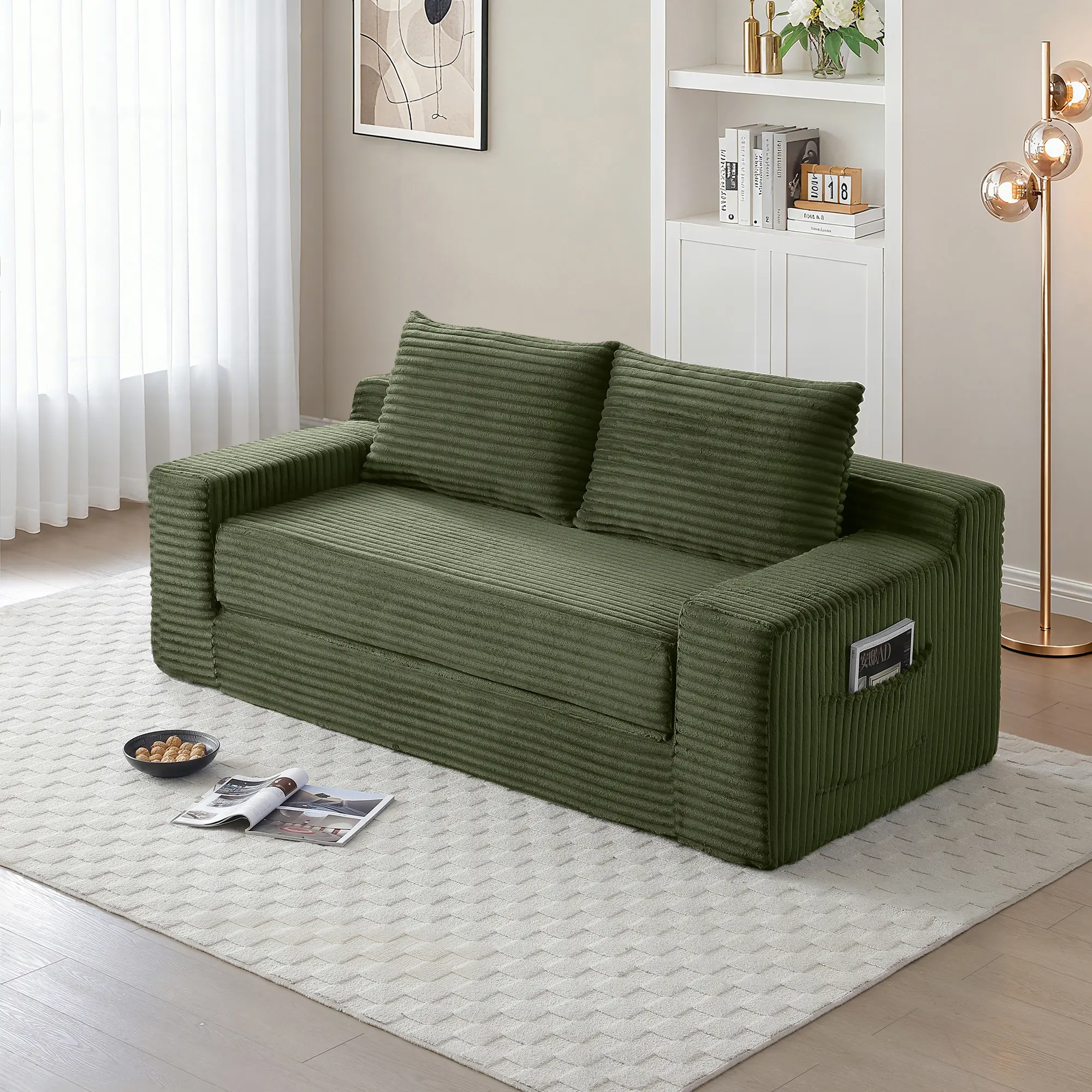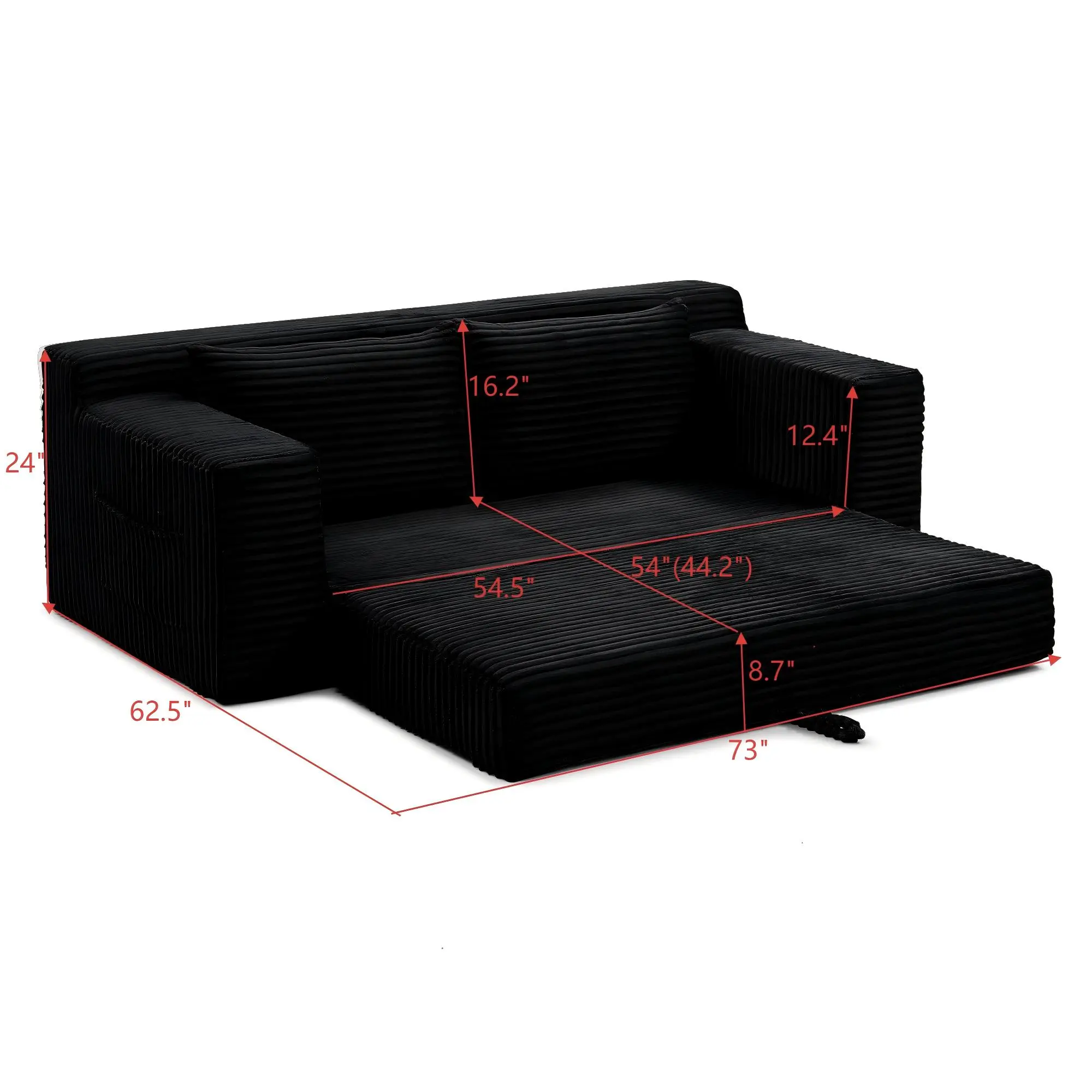 This sofa features a pull-out bed, convertible with a hand strap. It functions as a comfortable sofa by day and a convenient bed by night. Ideal for hosting guests and small living spaces. The corduroy boneless cloud couch design with high-density foam filling ensures ultimate relaxation. No frame for a cozy lounge experience.