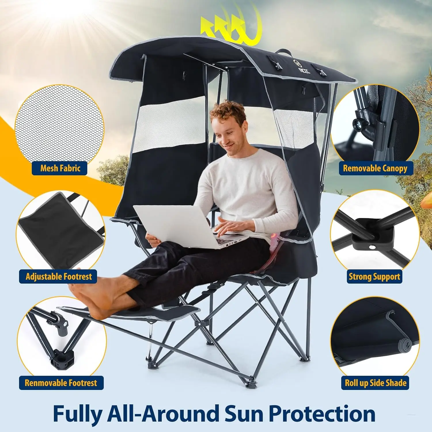 Built-in Sun Shade Canopy: Stay cool and shielded from the sun with the detachable canopy, offering portable shade for all your outdoor activities. The two side shades can be easily rolled up for added flexibility, allowing you to adjust the coverage as needed.