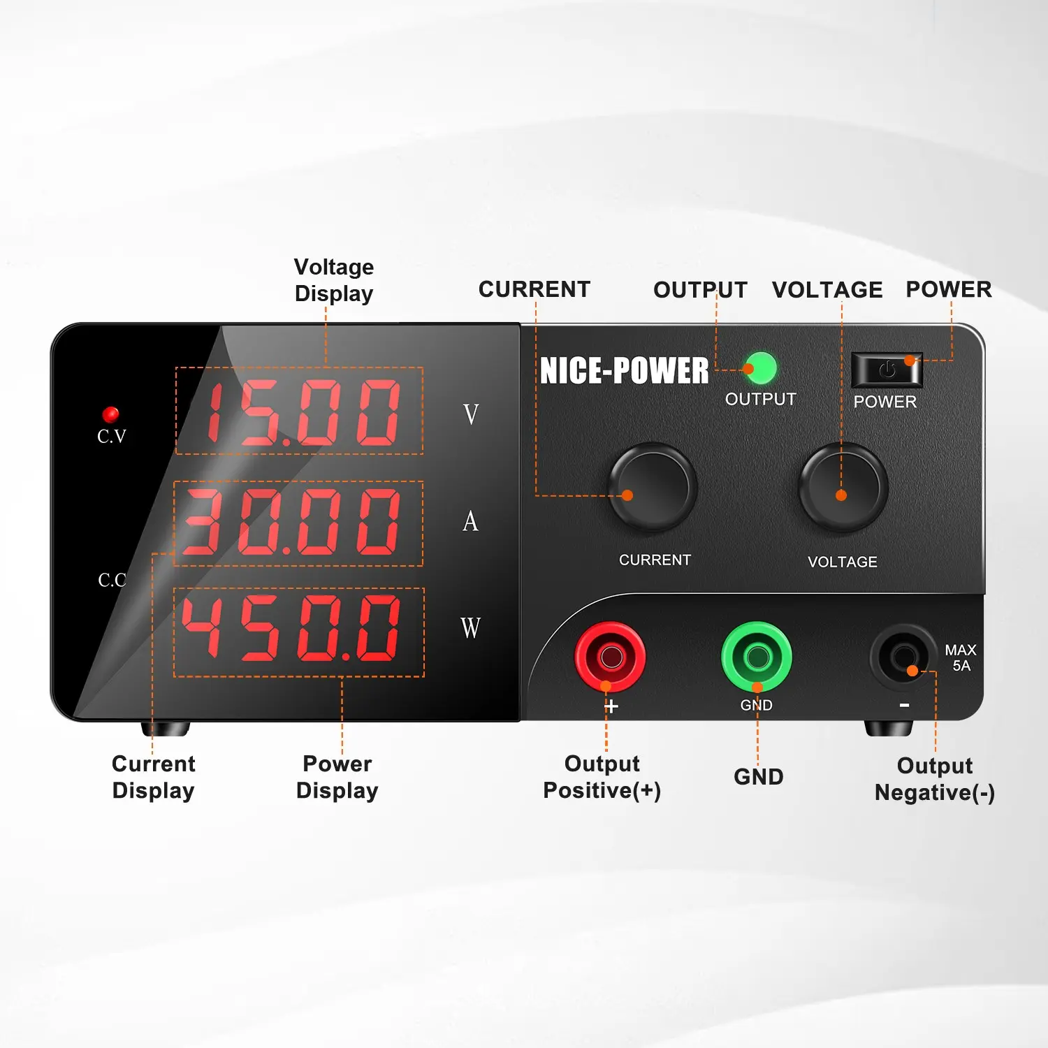 5. Nice-Power Variable Dc Power Supply, 15v 30a 450w High Power Bench Power Supply, Encoder Knob and Output Switch, Lab Power Supply