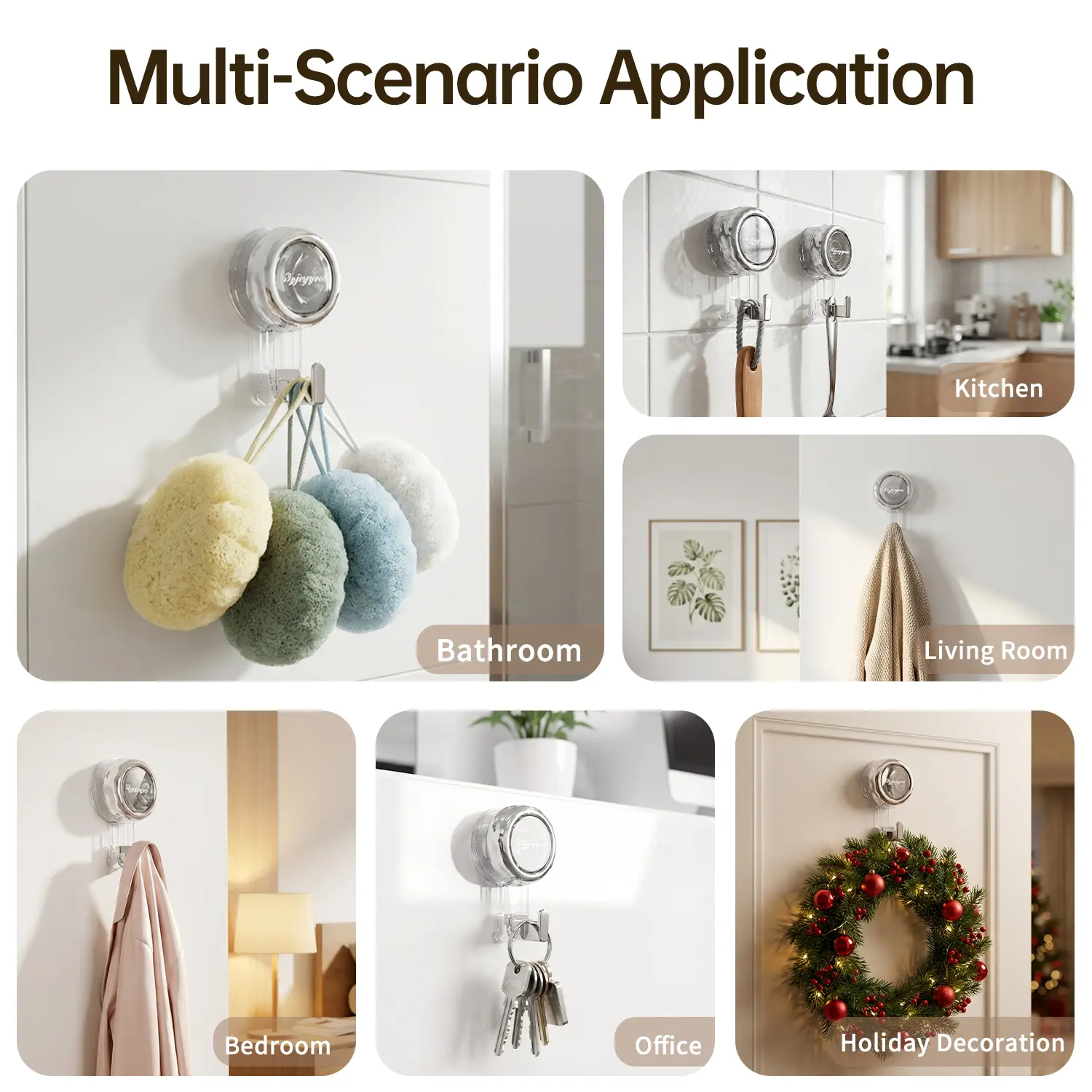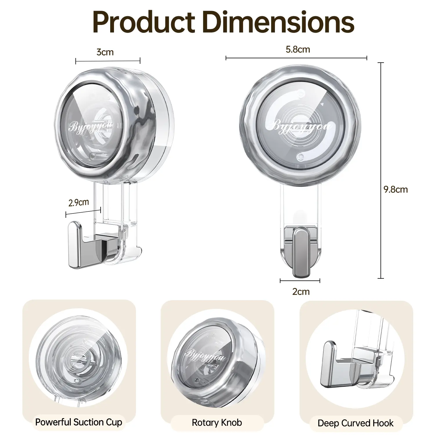 ·【EASY & QUICK TO INSTALL WITHOUT TOOLS 】– No tools, no screws and no drilling holes on the wall by using the vacuum suction hooks. Simply choose a smooth surface, peel off the film and push the hook center hard .Then turn the knob to the right until it is completely tight. Easy install and never fall off. With a 360-degree rotation design, our strong Suction Cup Hooks for Shower allow you to feel free to stick in any direction, don't worry about crooked.