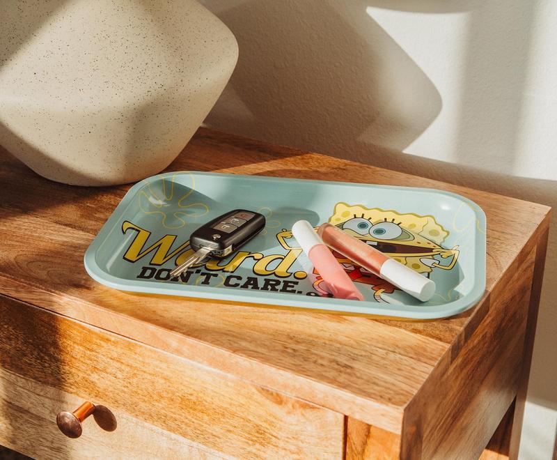 Take the stress out of making a mess with this tin tray inspired by the aquatic misadventures of SpongeBob Squarepants. With googly eyes and tongue lolling out, SpongeBob SquarePants shows off his silly side on this tray that's brimming with kooky charm and character. Wearing his signature red tie and brown shorts, Bikini Bottom's resident sea sponge admits that he's a little "Weird" but happily shrugs it off with, "Don't Care." Add some character to any space with this high-grade tin tray built for long-lasting landlubber use. Denizens of the deep will appreciate this tray's compact size, perfect for placing on your kitchen countertop, bookshelf, or bedside table. This amusing piece of home decor makes an ideal solution for storing your trinkets and mementos, or displaying your precious Bikini Bottom keepsakes. Get weird and wildly organized with this officially licensed collectible from SpongeBob SquarePants.