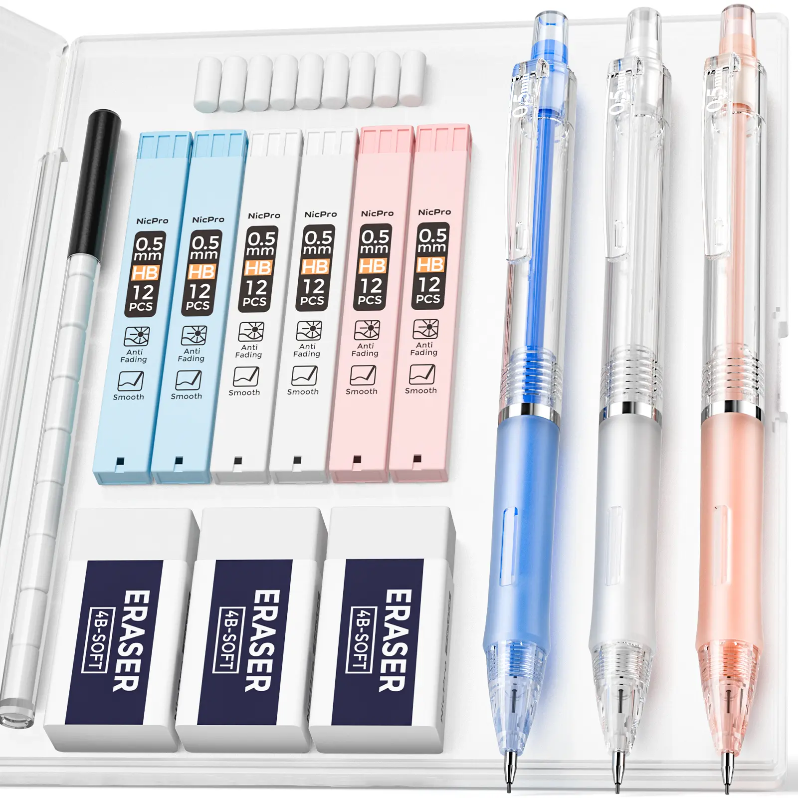 This set includes 23 pieces: 0.5 & 0.7 mm mechanical pencils, a case, 12 HB lead refills, 3 erasers, and 9 eraser refills. Ideal for writing, drawing, and sketching. Available in blue, pink, and white colors. 📏