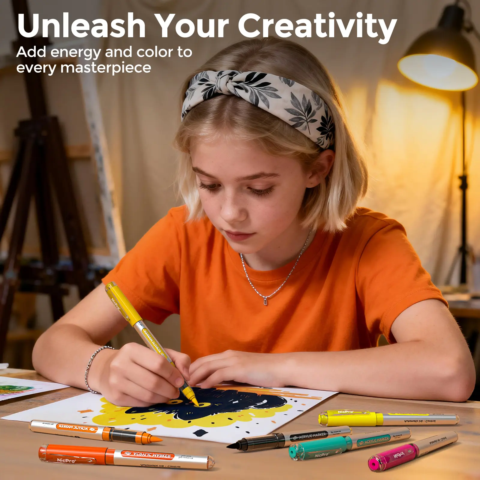 Nicpro Acrylic Paint Marker Set featuring a full range of primary and complementary tones. The set comes with a plastic storage case, a user guide, and a color swatch sheet. Organize your markers and choose the perfect shade for every project.