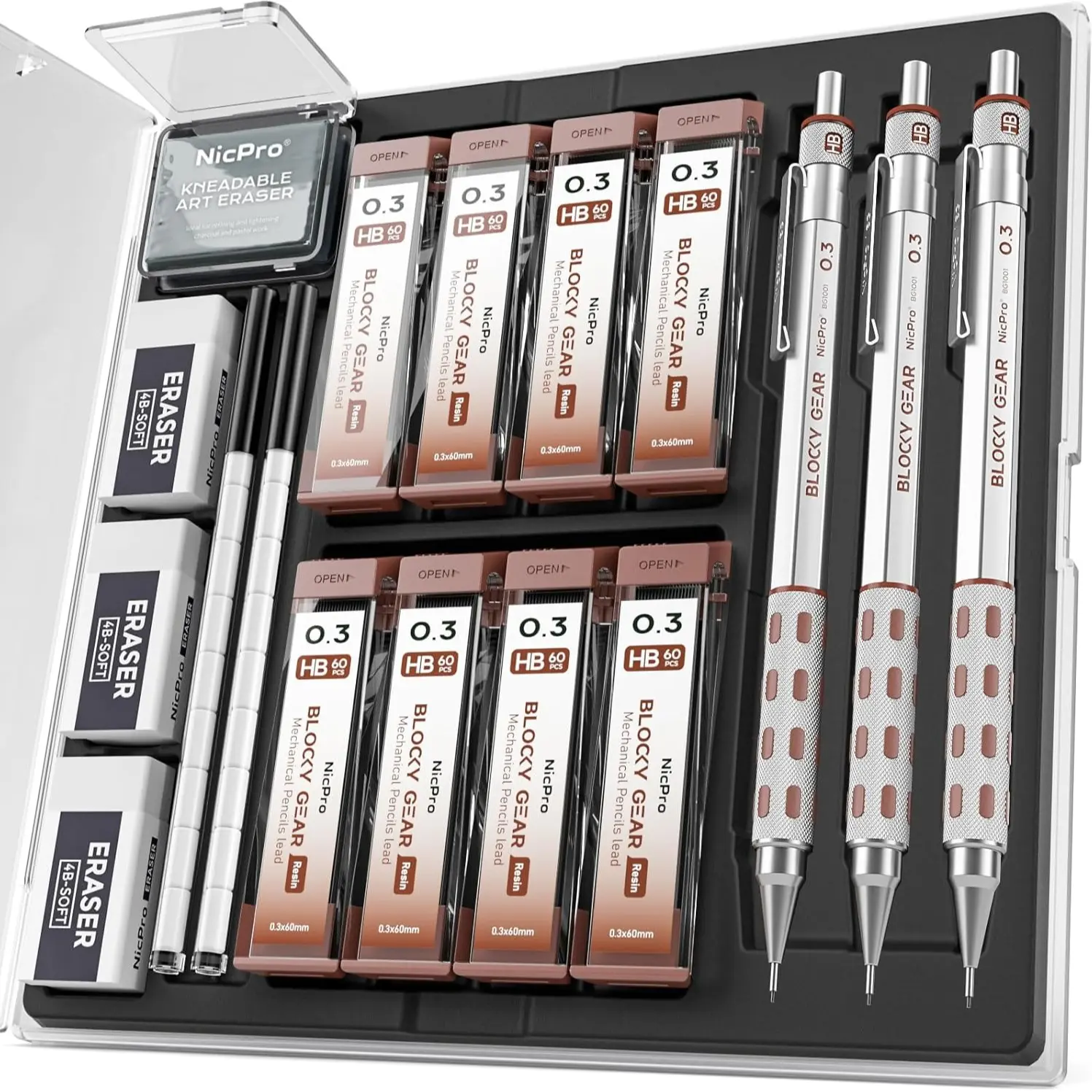 ·Nicpro Blocky Gear: Includes 3Pack metal 0.5mm mechanical pencils and 8 tubes of 0.5 mm lead refills (6 tubes of HB and 2 tubes of 2B), 60Pack per tube, 3Pack 4B latex-free erasers, 18Pack replaceable cap erasers, and 1 kneaded eraser.