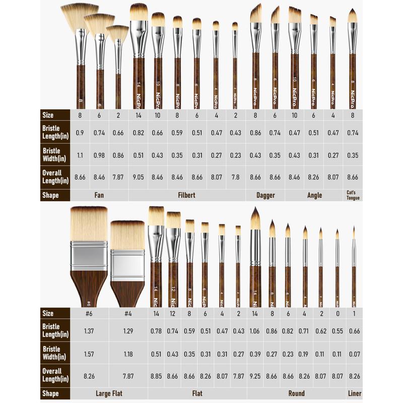 ·Great Value Paintbrush Set: 30 pieces including 8 x Flat Tip (#6, #4, 14, 12, 8, 6, 4, 2); 6 x Round Tip (14, 8, 6, 4, 2, 0); 6 x Filbert (14, 10, 8, 6, 4, 2); 3 x Angle (10, 6, 4); 3 x Fan (8, 6, 2); 2x Dagger (8, 6); 1 x Cat's Tongue (8); 1 x Liner (1); 1 x Paint Spatula; 1 x Nylon cloth roll bag. Whether you're working on detailed paintings or large coat applications, this ALL-IN-ONE set of different-sized brushes will meet your needs and bring every stroke to life