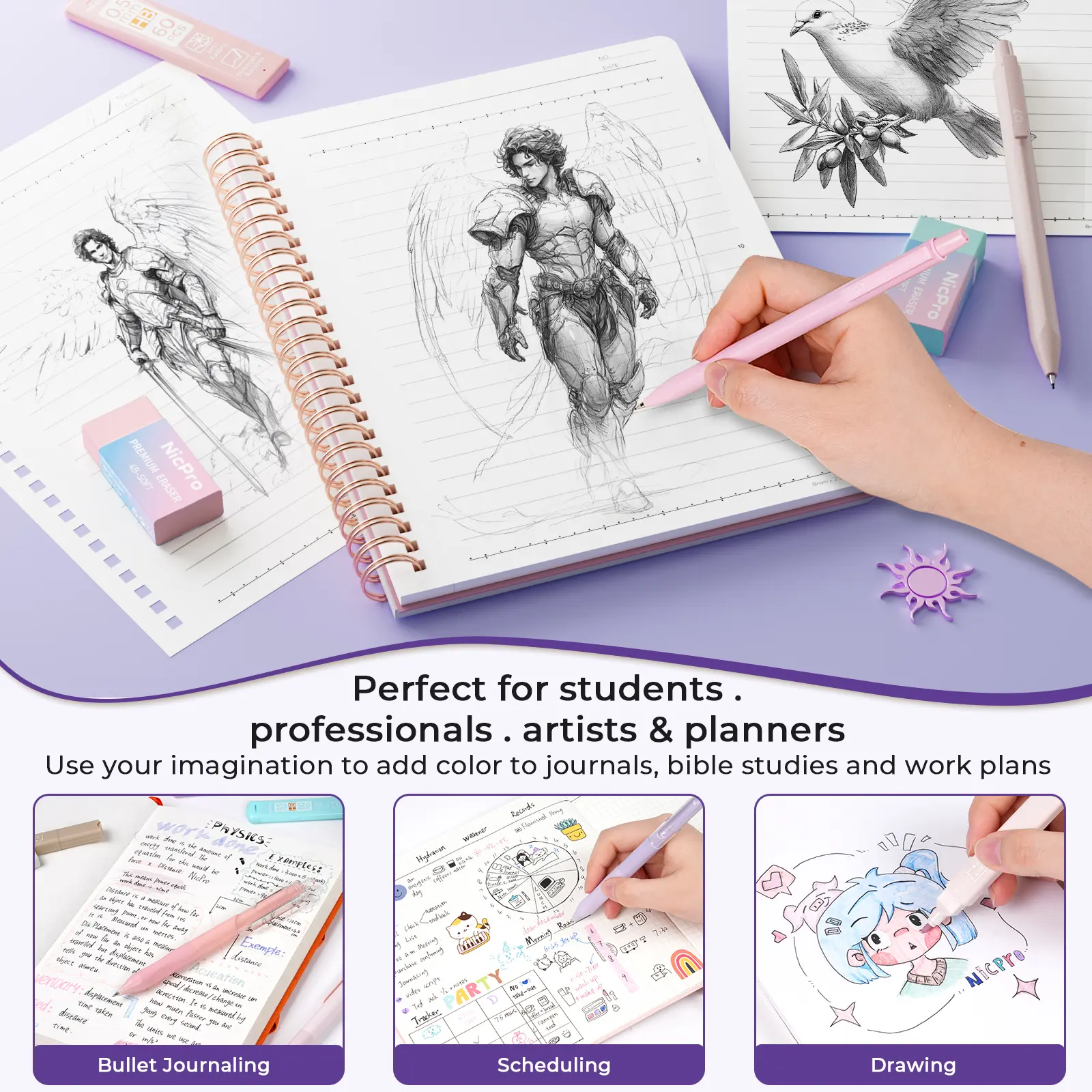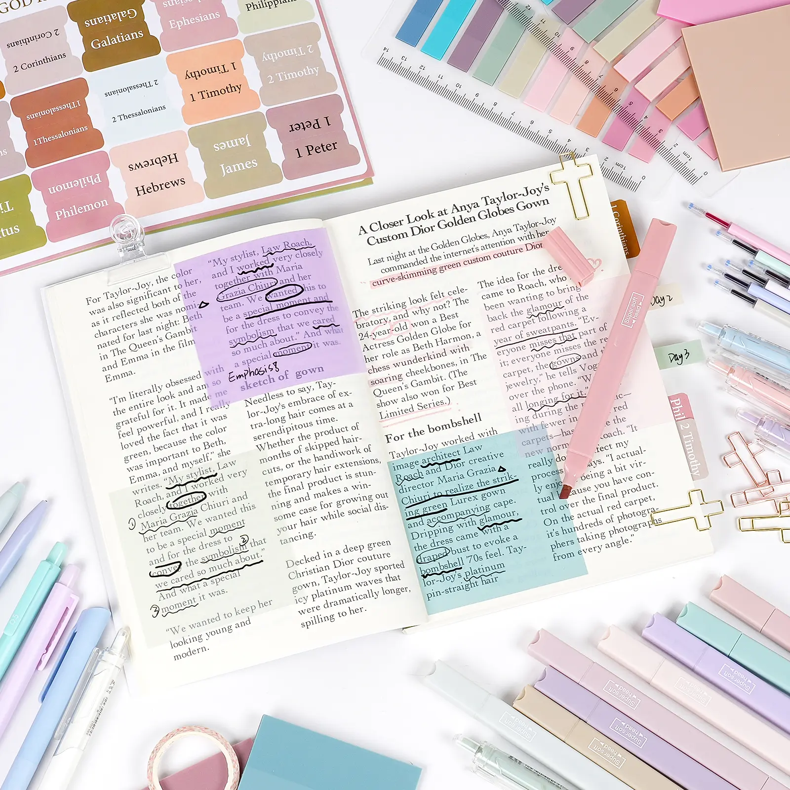 ·Come with a spiral notebooks, 12pcs bible highlighters, 6pcs colored ink gel pens with 6pcs refills, 5pcs black ink gel pens with 5pcs refills, 6pcs mechanical pencils 0.5, 0.7mm with 360 pcs lead refills, 3 erasers and 18 eraser refills, a quick dry double head permanent markers, 5 sheets bible tabs(15 Tabs/Sheet), 300pcs transparent sticky notes and 200pcs transparent sticky index tab, 4 rolls bible washi tapes, 10pcs bible clips in a pencilcase.
