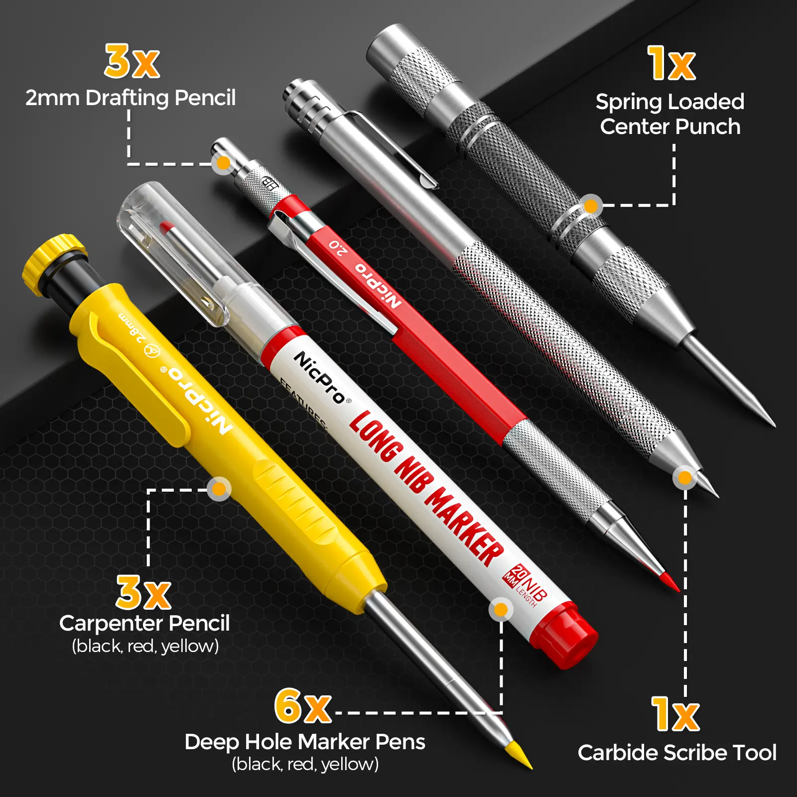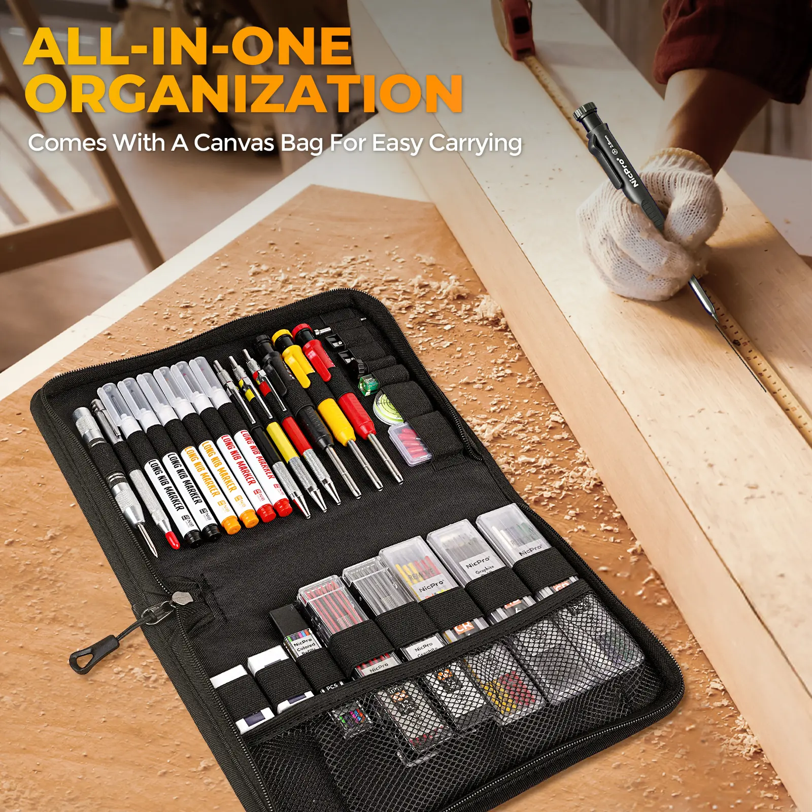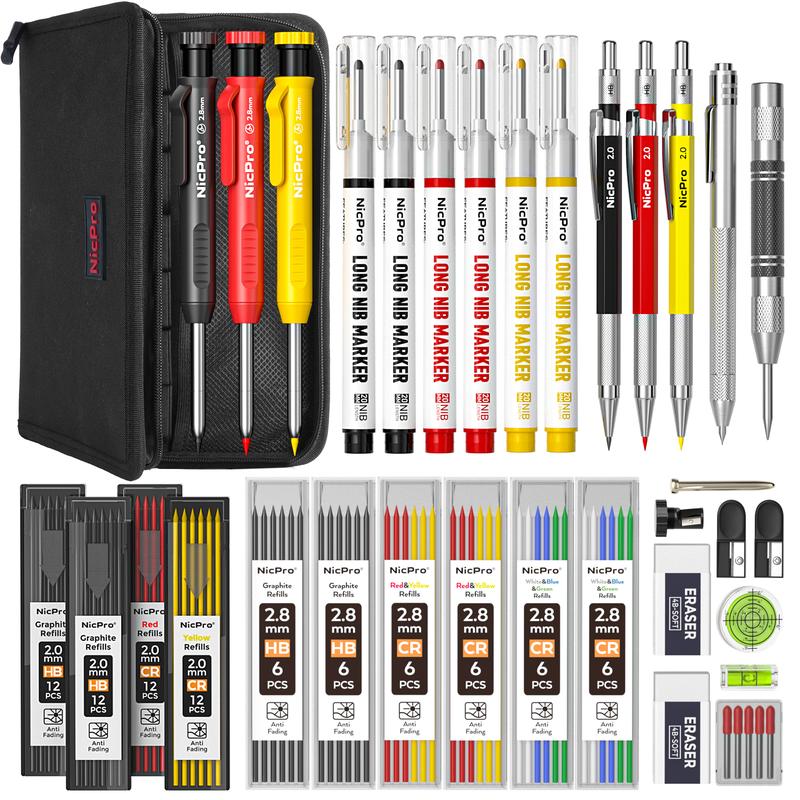 ·You will get 3 pack 2.8mm sturdy carpenter pencils, 36pcs of 2.8mm lead refills in 6 colors, 6 pack long nib marker in 6 colors, 3 pack mechanical pencil 2.0mm with 48 piece 2.0 mm refills in 3 colors, 1 pack carbide scribe tool with 5 replacement Tip, 2 pcs mini spirit level, 1 pcs automatic center punch tool with 1 spare needles (replaceable), 2 pcs 4B eraser, 3 sharpeners and 1pcs big capacity pen bag. With this comprehensive carpenter pencil set allows you to finish your work faster and more easily