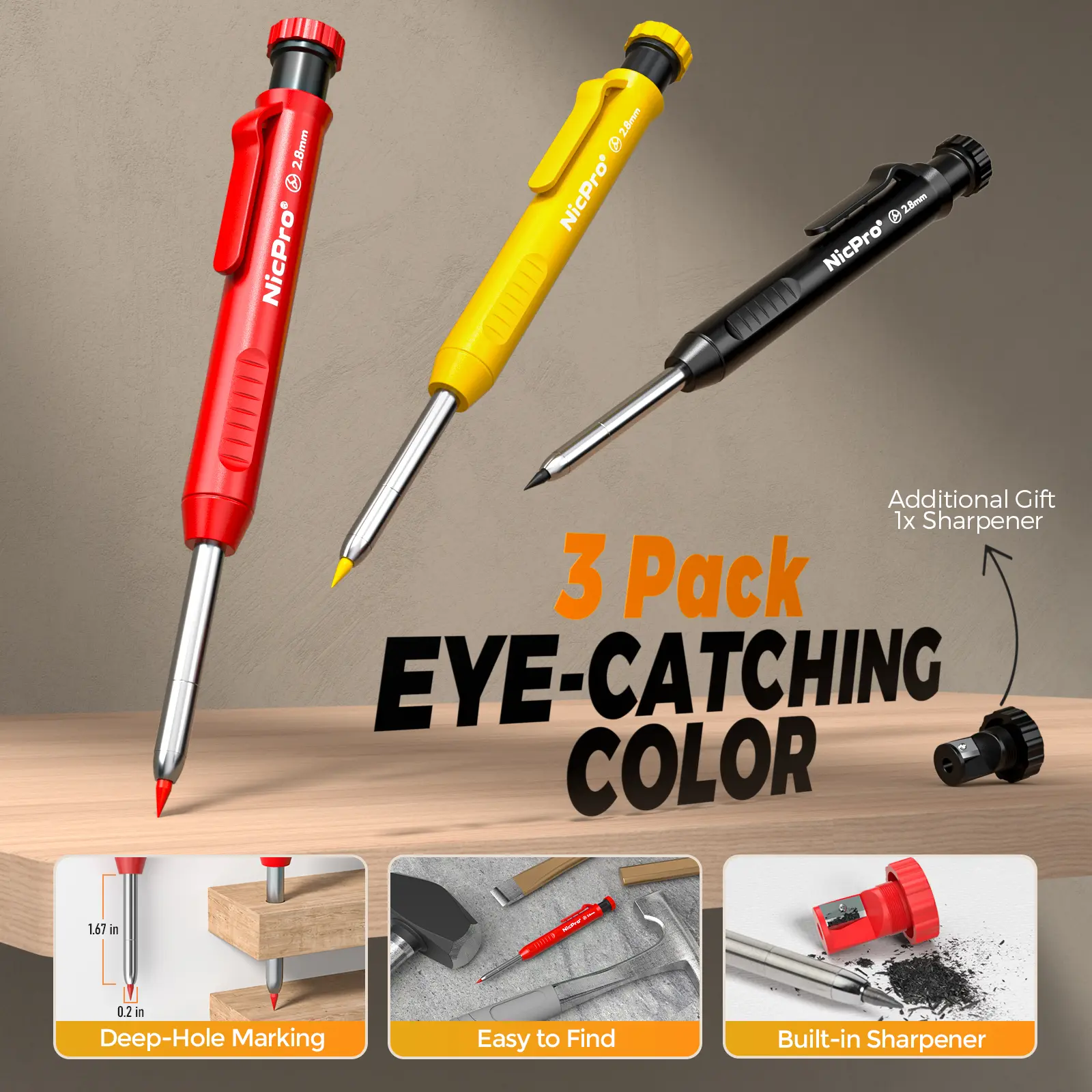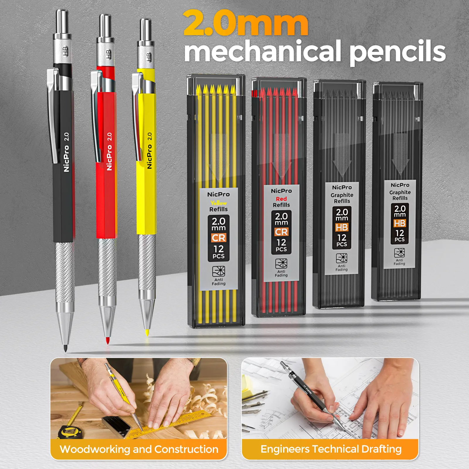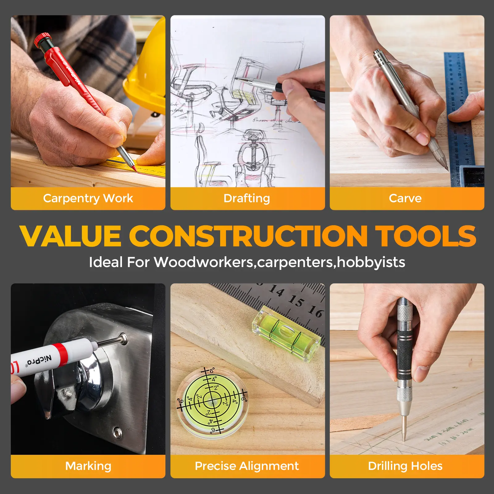 ·You will get 3 pack 2.8mm sturdy carpenter pencils, 36pcs of 2.8mm lead refills in 6 colors, 6 pack long nib marker in 6 colors, 3 pack mechanical pencil 2.0mm with 48 piece 2.0 mm refills in 3 colors, 1 pack carbide scribe tool with 5 replacement Tip, 2 pcs mini spirit level, 1 pcs automatic center punch tool with 1 spare needles (replaceable), 2 pcs 4B eraser, 3 sharpeners and 1pcs big capacity pen bag. With this comprehensive carpenter pencil set allows you to finish your work faster and more easily