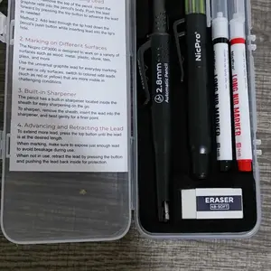 ·Complete 6-in-1 Carpenter Pencil Kit – Includes 1pcs pre-loaded 2.8mm mechanical construction pencil, 6 refills in an anti-snap dispenser (2 black, 2 yellow, 2 red), 2 long nib markers, 1 protective sheath with sharpener, and 1 eraser—all packed in a durable storage box.Tough, jobsite-ready—finish work faster and more precise.