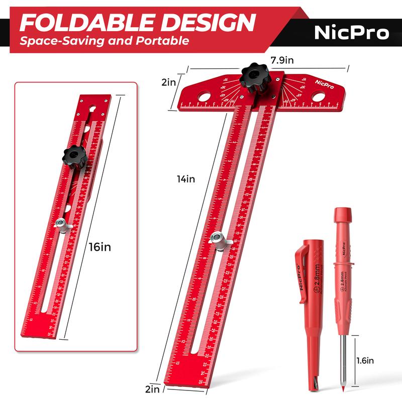 ·Built to Last – Premium Aluminum Alloy: Nicpro carpenter right angle ruler is crafted from premium aluminum alloy, each part is sturdy, wear and corrosion resistant. It can withstands drops, heavy impacts, and daily wear from sawdust or moisture. and preserving precise measurements throughout extended use