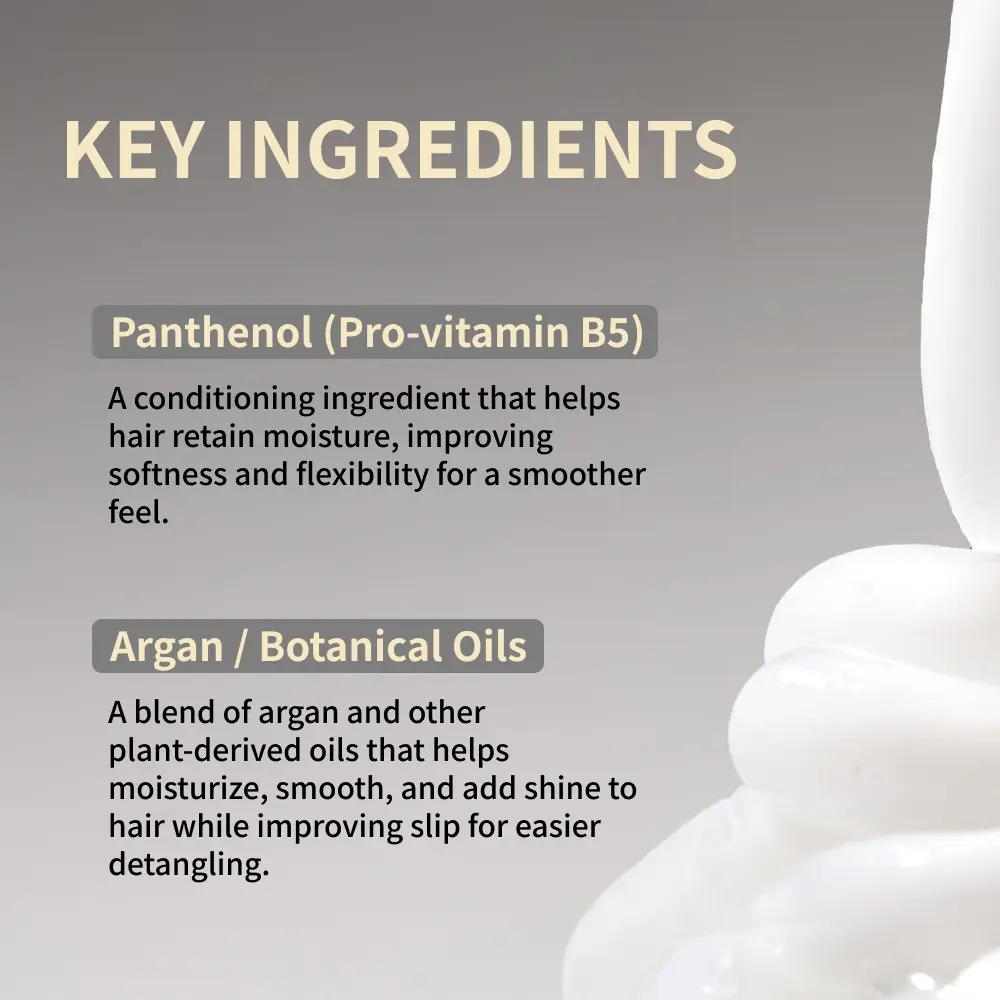 ·Instant Slip & Shine: A premium blend of Argan and Botanical Oils improves slip for easier detangling, smoothing the hair cuticle to lock in a lustrous, glassy shine.